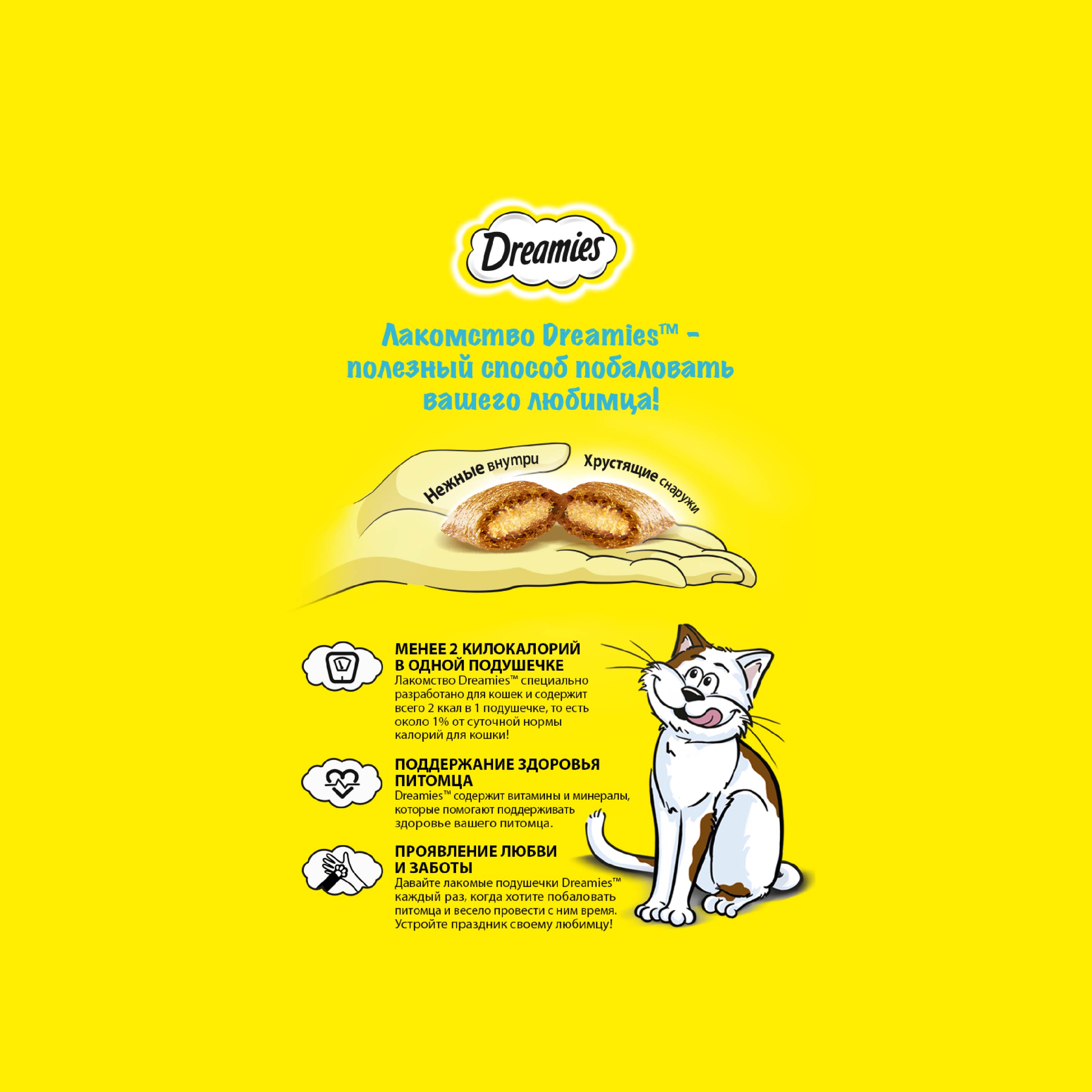 В состав Dreamies Лакомые Подушечки входят важные для кошки питательные вещества, витамины и минералы, а значит, такое угощение приносит не только радость, но и пользу.