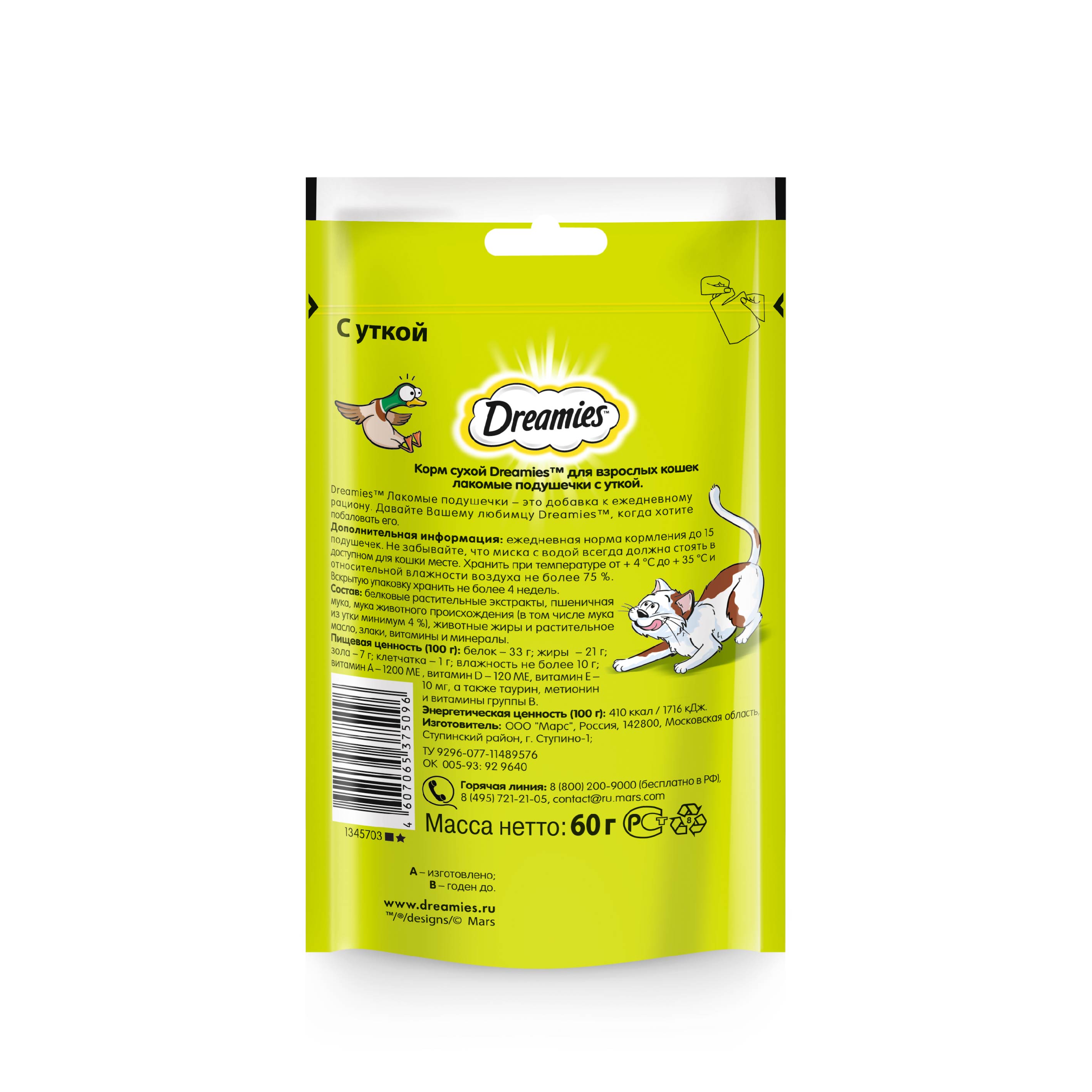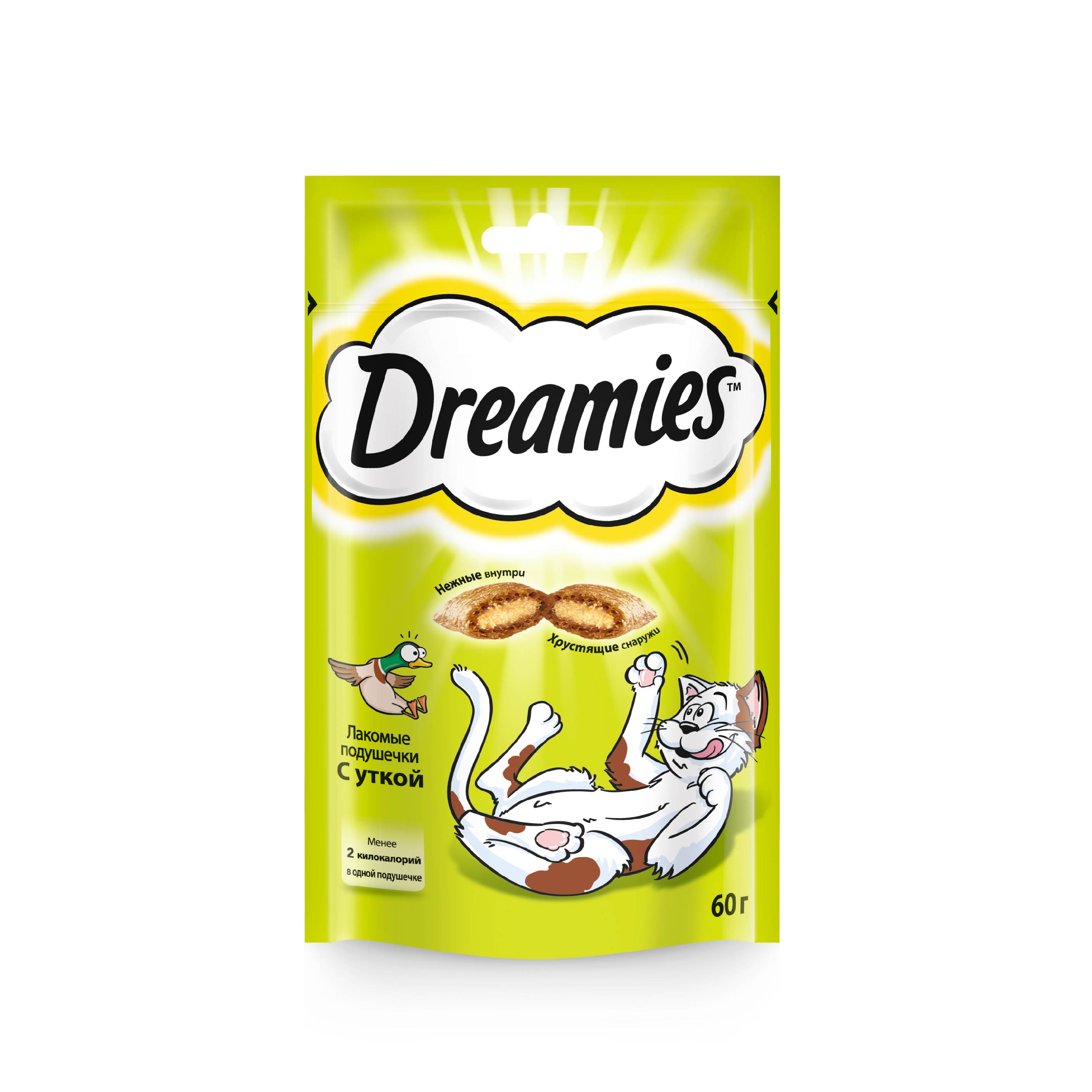Dreamies лакомые подушечки с уткой - это добавка к ежедневному рациону. Давайте вашему любимцу Dreamies когда хотите побаловать его. Незабываемая нежная утка в хрустящей вкусной подушечке – это достойная награда вашему любимому зверю. Теперь ему не нужно охотиться, стоит только открыть упаковку, и уточка никуда не убежит!