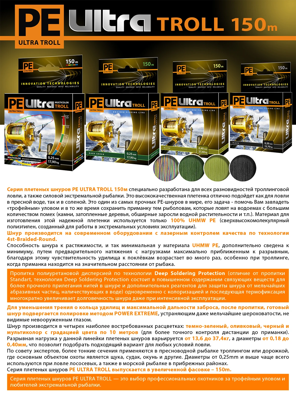--Серия плетеных шнуров PE ULTRA TROLL выпускается в увеличенной фасовке – 150m.