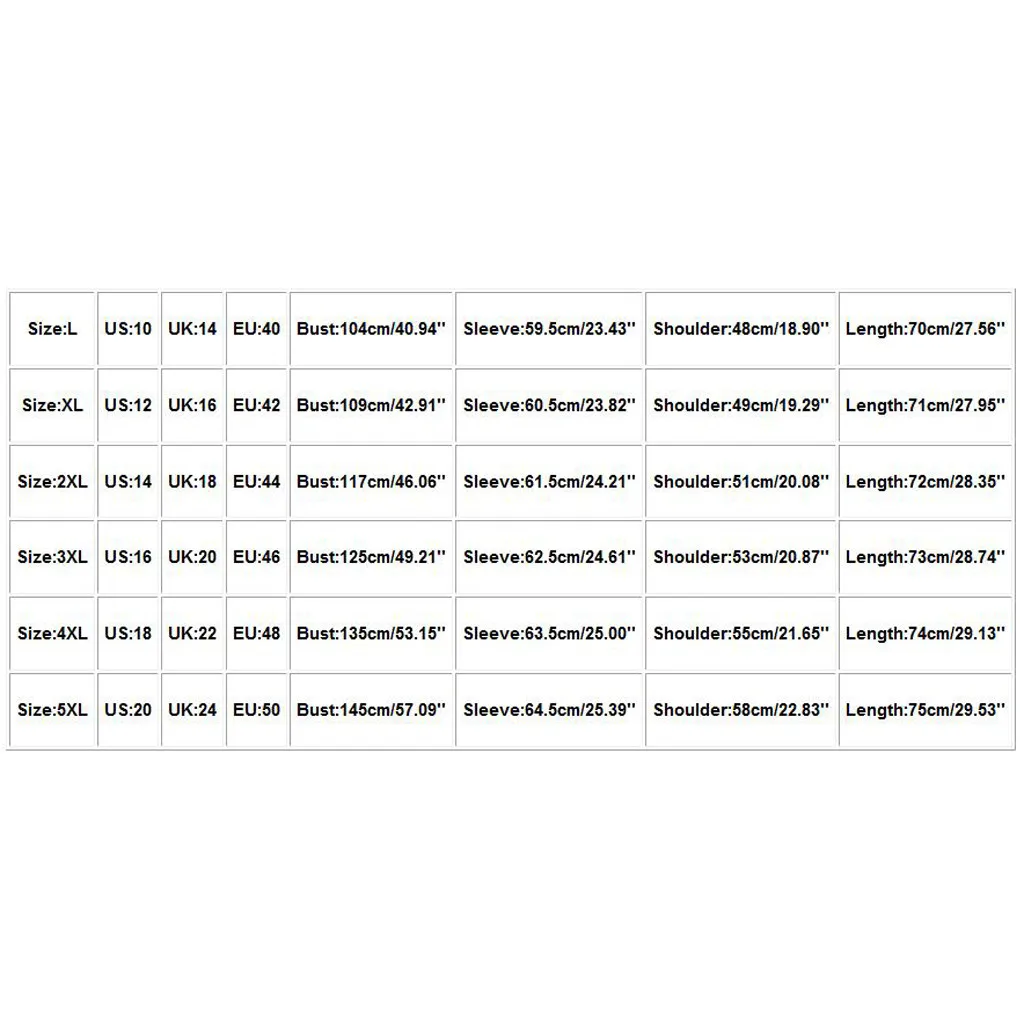 Что вы получаете: 1 шт. Женское пальто Размер Свяжитесь с нами Великобритания ЕС Обхват груди Рукава Сумка на плечо Длина L 10 14 40 104 см/40,94'' 59,5 см/23,43'' 48 см/18,90'' 70 см/27,56'' XL 12 16 42 109 см/42,91'' 60,5 см/23,82'' 49 см/19,29'' 71 см/27,95'' 2XL 14 18 44 117 см/46,06'' 61,5 см/24,21'' 51 см/20,08'' 72 см/28,35'' 3XL 16 20 46 125 см/49,21'' 62,5 см/24,61'' 53 см/20,87'' 73 см/28,74'' 4XL 18 22 48 135 см/53,15'' 63,5 см/25,00'' 55 см/21,65'' 74 см/29,13'' 5XL 20 24 50 145 см/57,09'' 64,5 см/25,39'' 58 см/22,83'' 75 см/29,53''