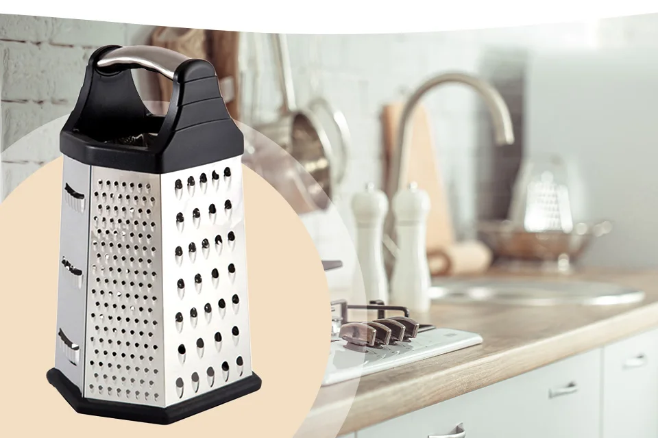 Терка имеет шесть граней для работы с продуктами, каждая грань соответствует своему размеру и предназначена под приготовление продукта нужного размера по требованию рецепта.