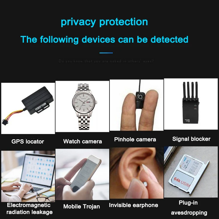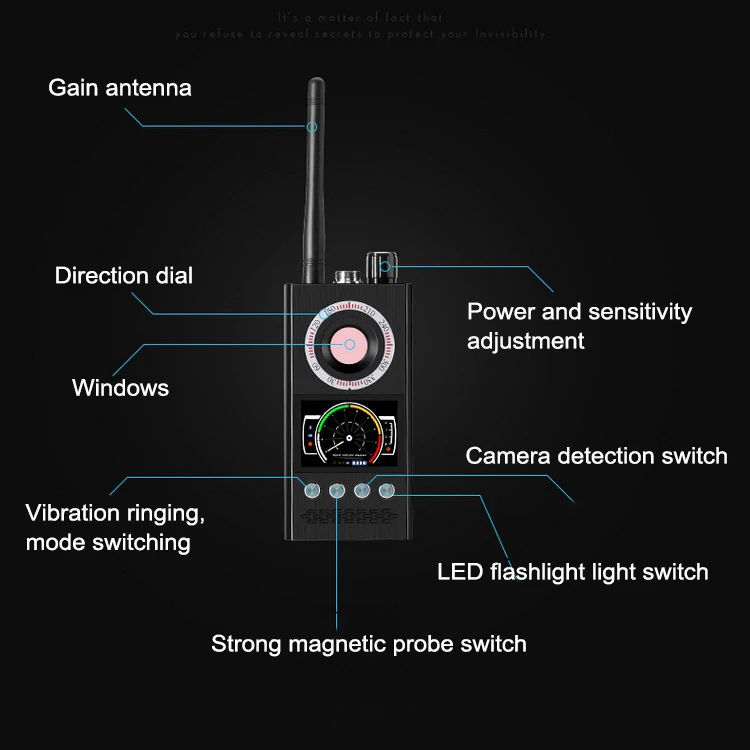 Новое поколение детекторов выходит, он построен с военным стандартом качества, по имени K88. И светодиодный дисплей с кодовой таблицей добавляется. Он может интенсивность источника сигнала более точно, это новый Интеллектуальный режим, который обновляется интеллектуальным режимом обнаружения. Он имеет эффективный и удобный метод использования, пусть все, что нарушает вашу частную жизнь, не скрывает места. Это оборудование использует американские военные технологии, это эксклюзивные исследования и разработки, направленный инструмент категории безопасности, в основном функционирует для рынка различных eavesdroppers, автомобильные трекеры, мобильный телефон под прикрытием программного обеспечения, беспроводные камеры pinhole, камеры наблюдения, оборудование для казино и так далее. В то же время детектор определяет величину Электрический измеритель радиации, который может защитить вас и вашу семью от электромагнитного излучения. Этот продукт впервые использует цифровую приемную модель, отличающуюся от других продуктов на рынке, она не только расширяет частоту исследования, И это также может эффективно избежать помех загроможденных сигналов во всем мире в жизни.