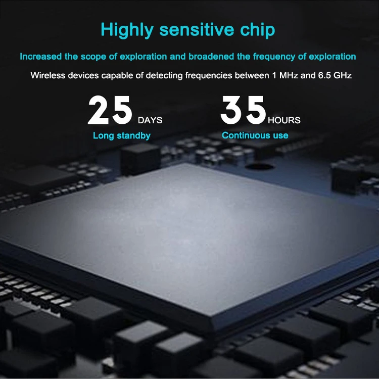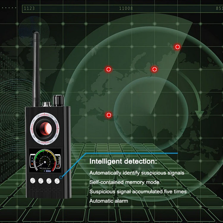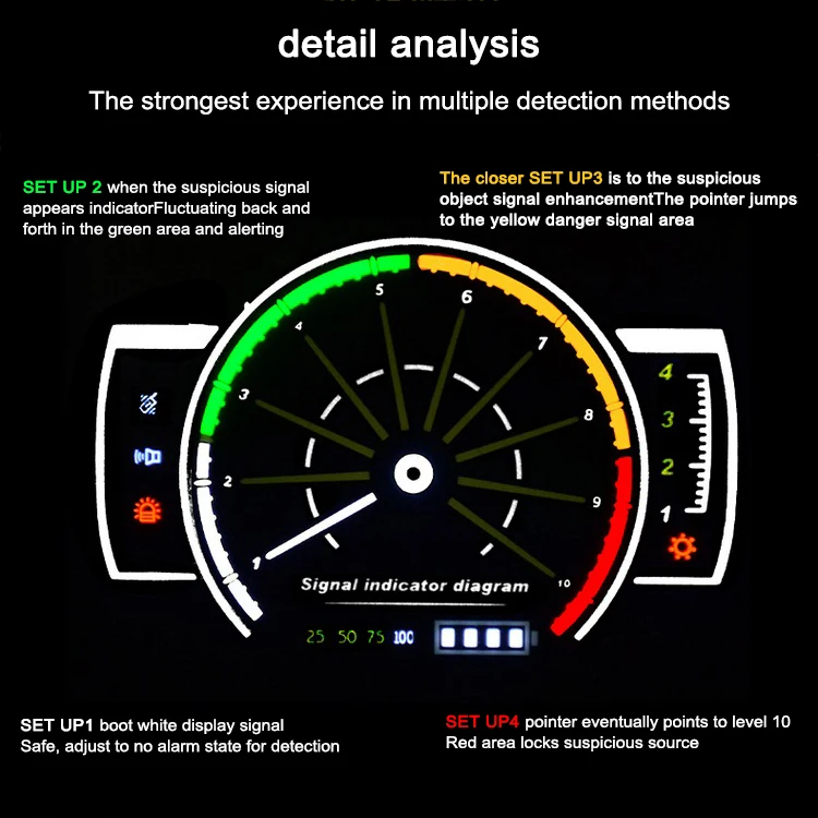 Интеллектуальный режим обнаружения: Включите питание и нажмите интеллектуальную кнопку обнаружения, машина войдет в состояние интеллектуального поиска. Устройство автоматически распознает, классифицирует и записывает каждую минуту. Интенсивность сигнала выше 8 уровней является опасным сигналом. Если один и тот же источник передает сигнал больше в пять раз, машина будет оповещать. (светодиодный указатель на уровне 1, и гудящий сигнал будет продолжать указывать опасный сигнал рядом.) Эта функция эффективно предотвращает прерывистое спящее прослушивание, съемку камеры, позиционирование GPS и т. д.