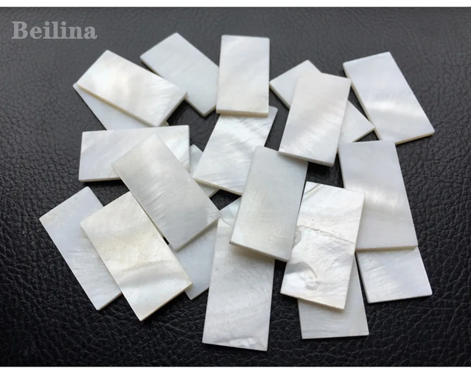Material:Freshwater mother of pearl shell Quantity:1lot(20pieces) Size:30mm×15mm Thickness:2mm Product application Shell laminates are used widely in different places. 1.For decorate musical instruments. 2.For furniture inlay 3.For DIY,etc. 4.For Mosaic lile NoticeWhite mother of pearl shell sheet is made of natural shell materials so the texture is different, the color and substance are a little different as well. Because of different lighting and display, the object color may a little different with the picutre, please make the object as the standard. It is a natural deep-sea shell product, the part surface may with worm hole or any other defects on it. As it's hand-made product,the size will be slightly erroneous, please buy it carefully if you mind.