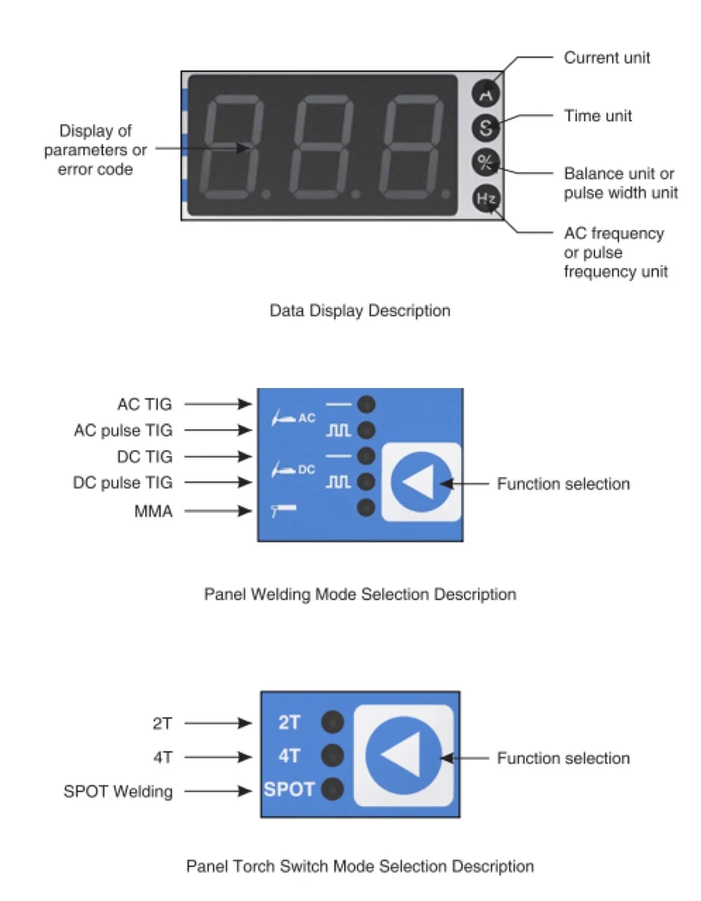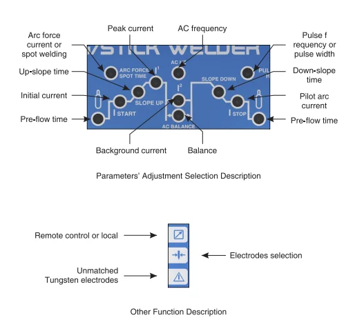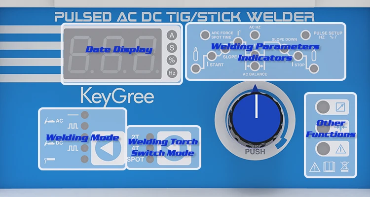 (AC TIG, AC pulse TIG, DC TIG, DC pulse TIG, MMA)