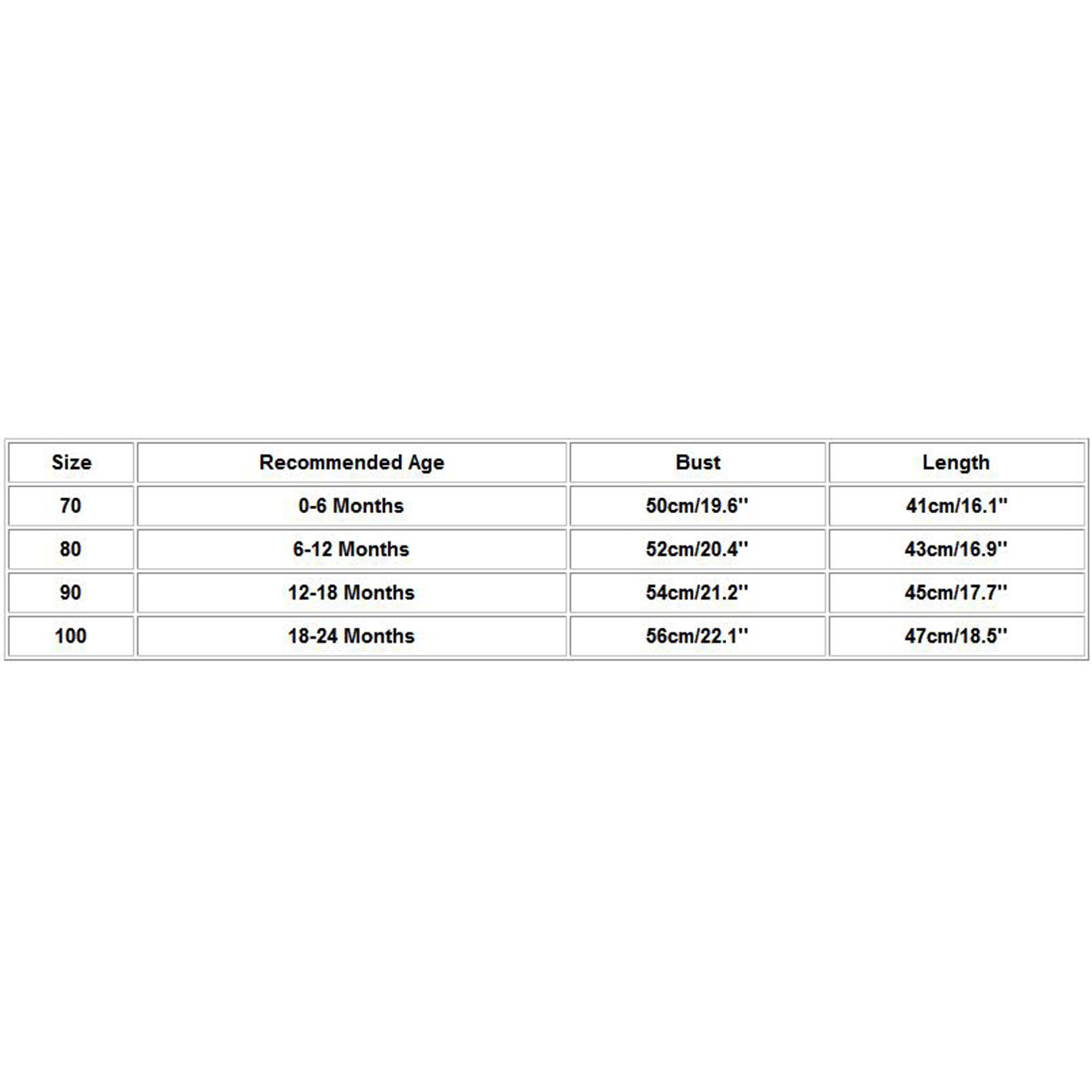 Размер Рекомендуемый возраст Бюст Длина 70 0-6 месяцев 50 см/19,6'' 41 см/16,1" 80 6-12 месяцев 52 см/20,4'' 43 см/16,9'' 90 12-18 месяцев 54 см/21,2'' 45 см/17,7'' 100 18-24 месяцев 56 см/22,1'' 47 см/18,5''Один раз связалась с этим магазином на Али, товар не получила, возникли сложности с возвратом средств. Очень не добросовестный продавец,... Читать отзыв полностью...