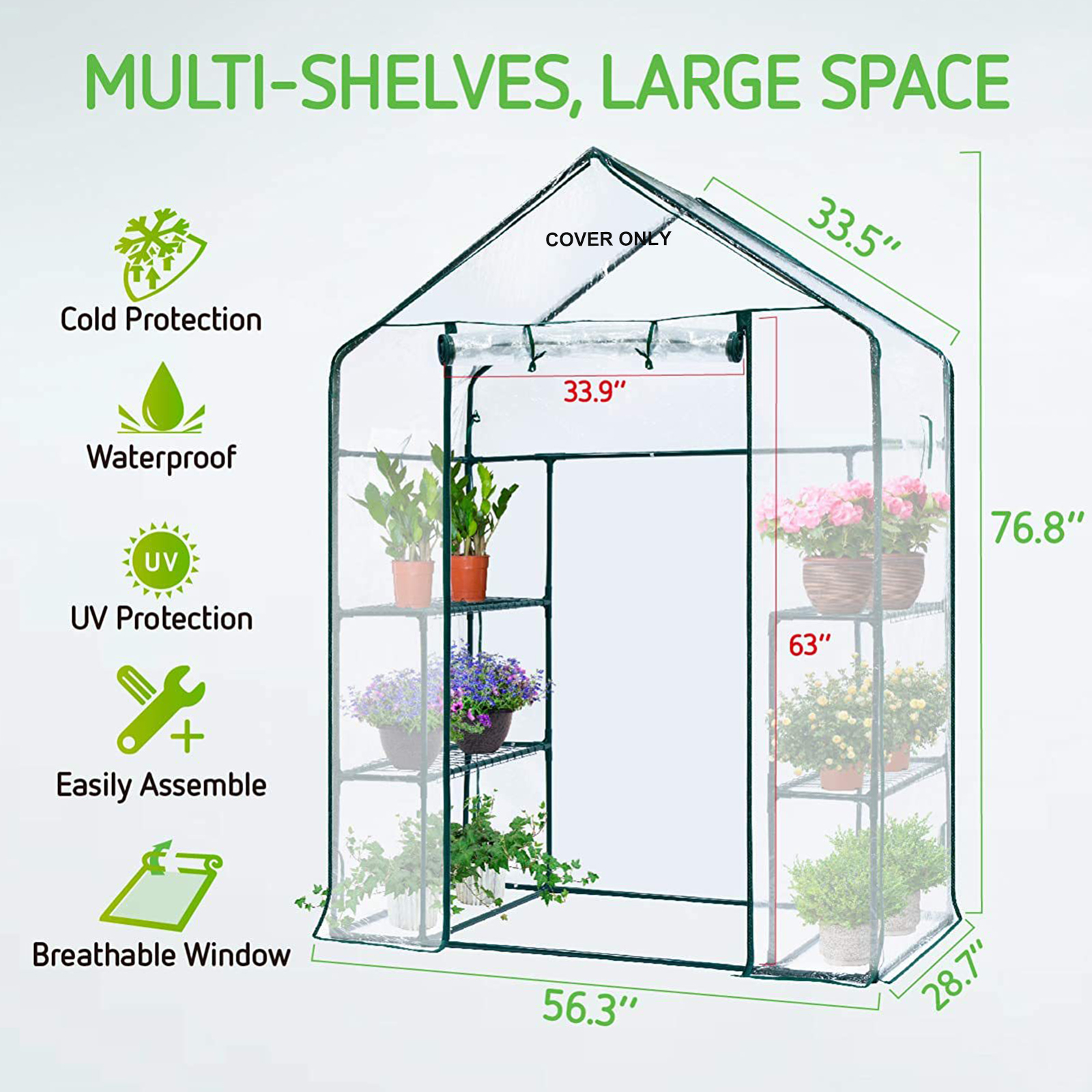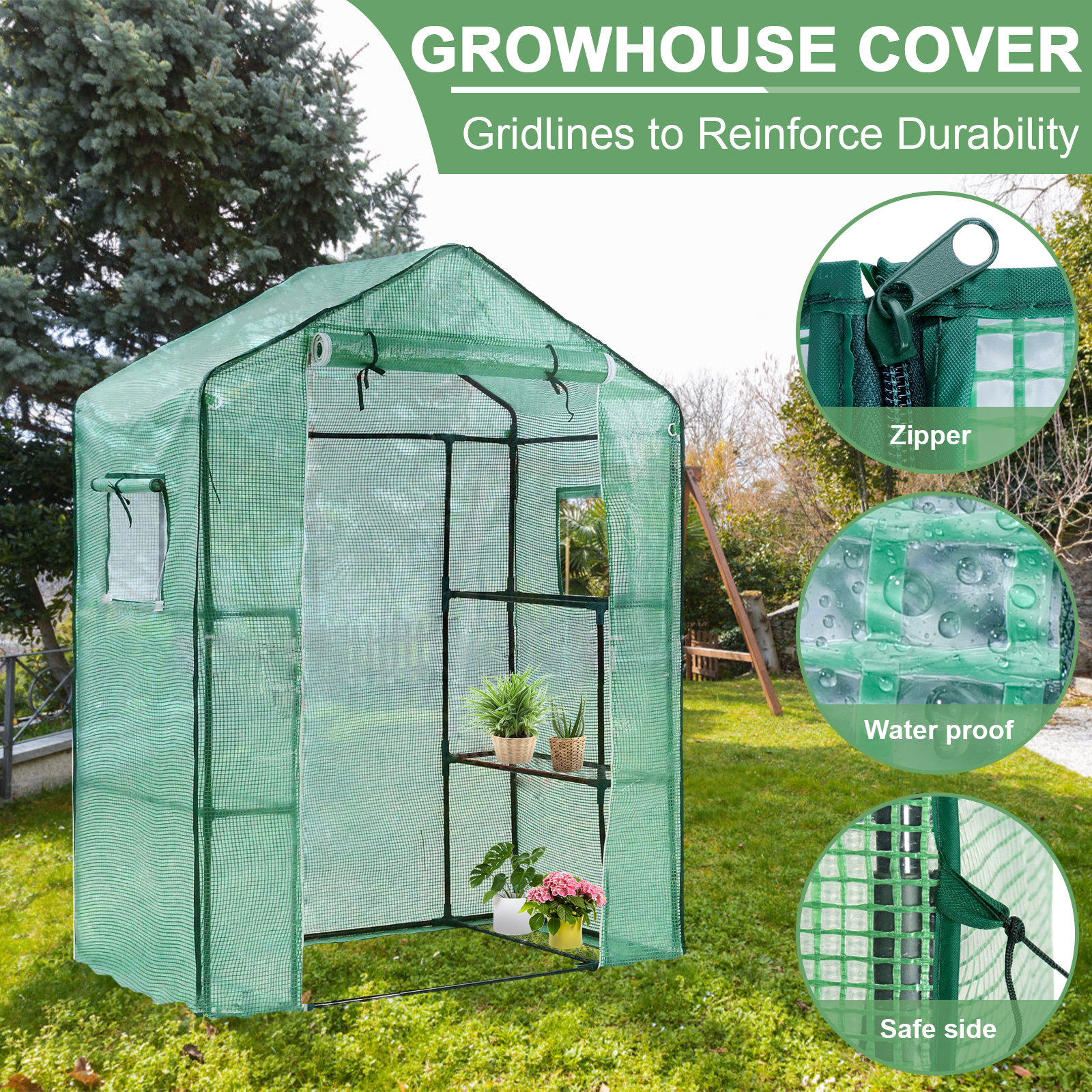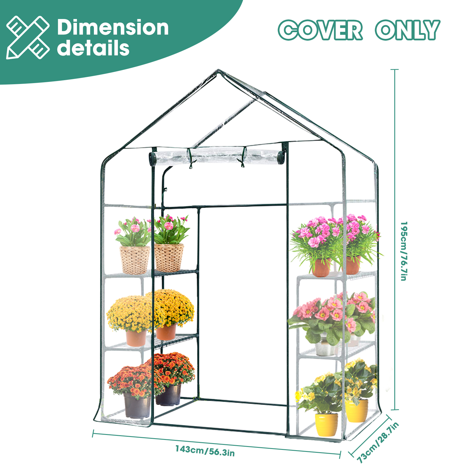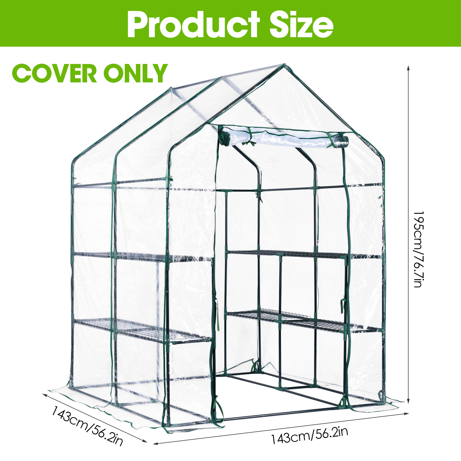 1. Замена теплицы: Усиленная сетчатая крышка является идеальной заменой для теплиц H195cm x W143cm x D73cm, мы рекомендуем измерить ваш каркас теплицы перед покупкой, чтобы убедиться, что крышка является правильным размером.
