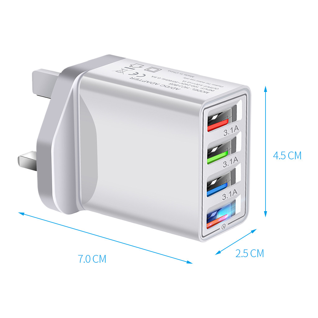 Материал: АБС-пластик и чехол из поликарбоната Вход: AC100-240V 50-60 Гц 0.35A DC5V = 3.5A (макс.) X4USB Ток зарядки: 2100 м Выход: 5 В/3,5a, 9 В/3,1a Размер: 44X20X88 мм (прибл.) Тип штекера: вилка стандарта ВеликобританииПосылка включает в себя: