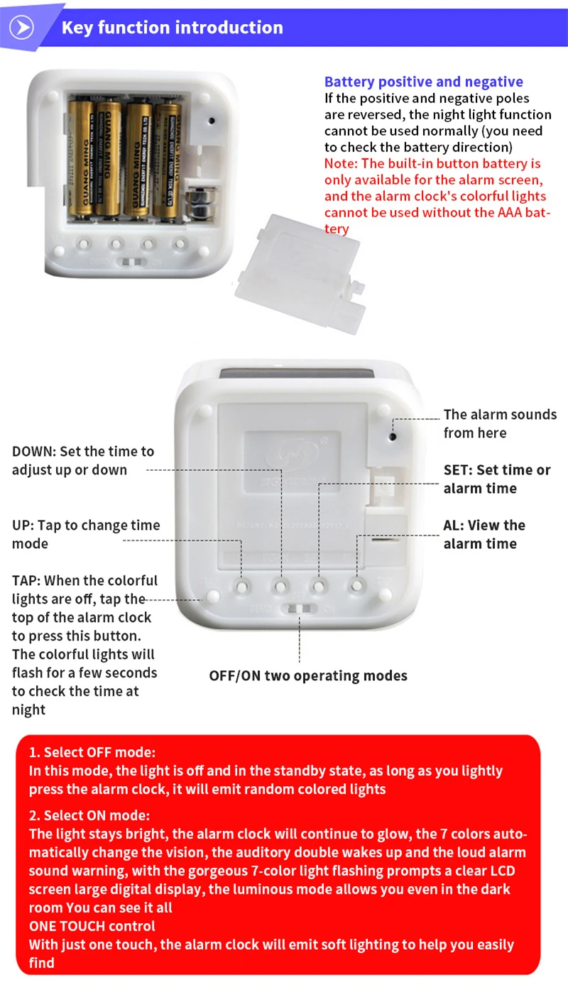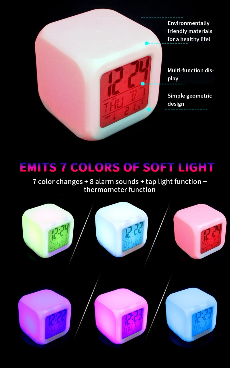 Материал корпуса: пластик Экран: светодиодный Размер: 8*8*8 см (куб) Функция: будильник, температура, изменение цвета Ночной светильник Примечание: 1. Будильник поставляется с 2 кнопками AG13 для отображения времени, будильника и дня недели 2. 4 батарейки AAA, требуемые цветной лампой, не включены, вам нужно подготовить себя В посылка есть инструкции на английском языке, так что вы можете понять функцию и основную работу этого будильника более удобно!