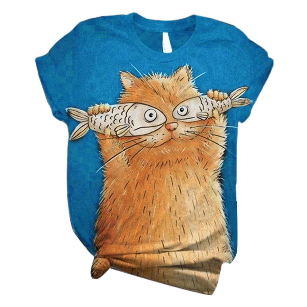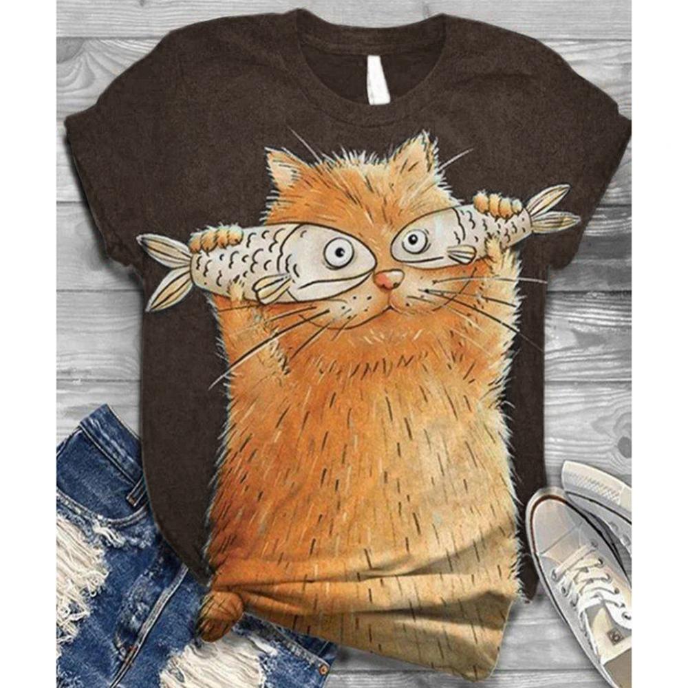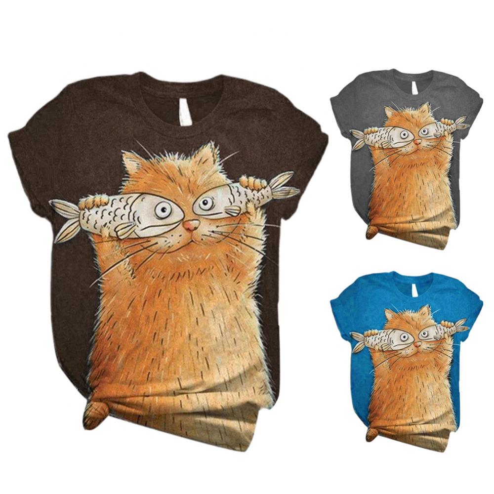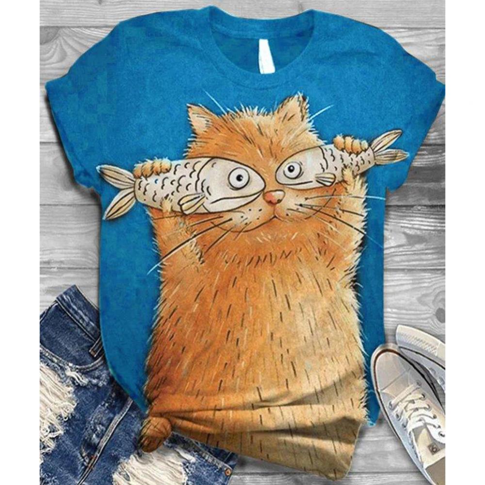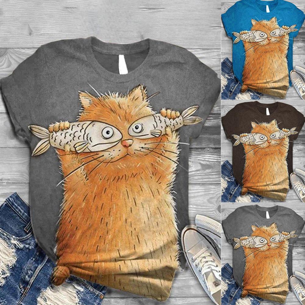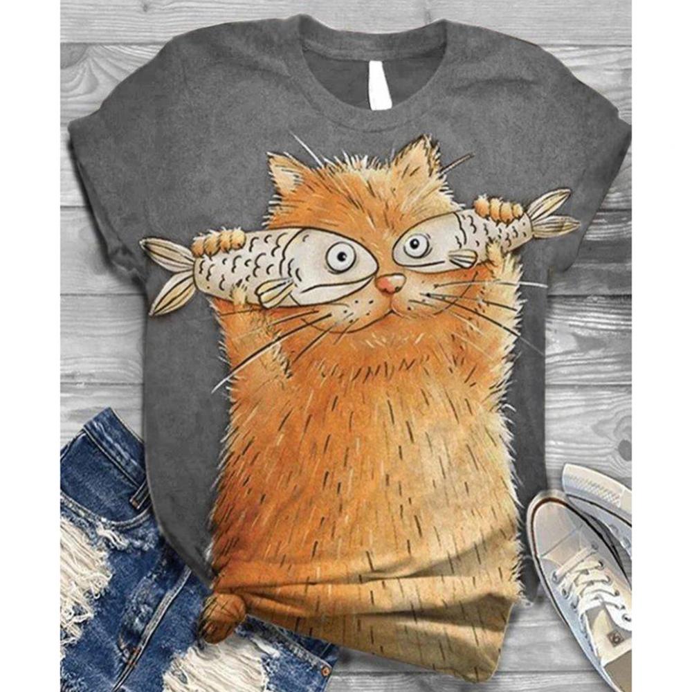 Harajuku женские футболки, Женская Повседневная летняя Свободная блузка с круглым вырезом и коротким рукавом с принтом кошки и рыбы, футболка, топ, толстовка, оверсайз
