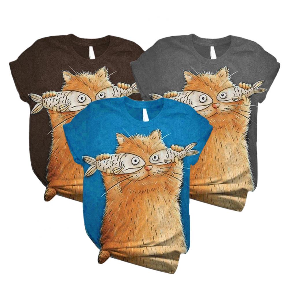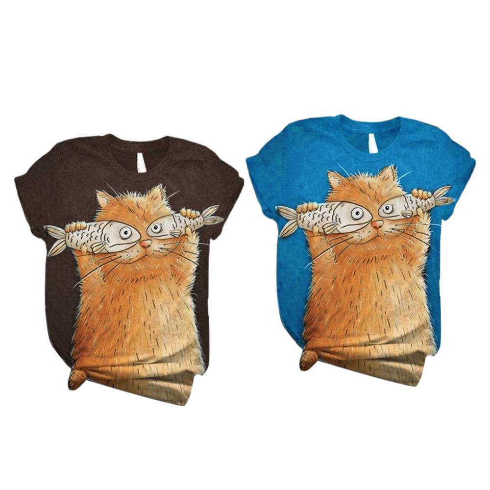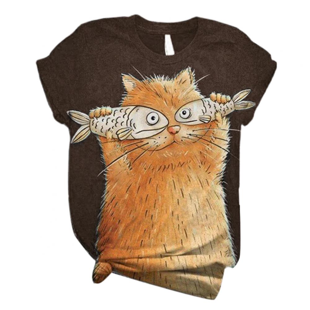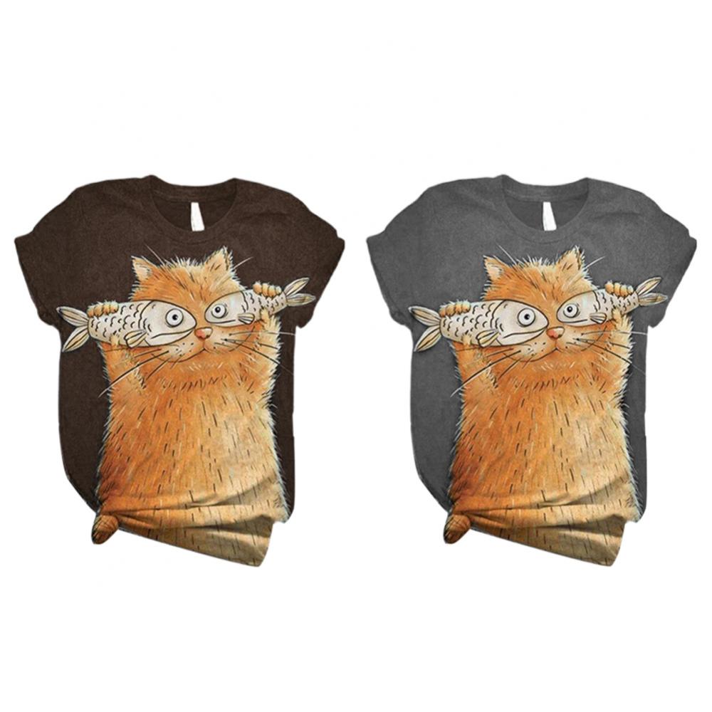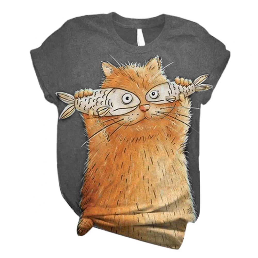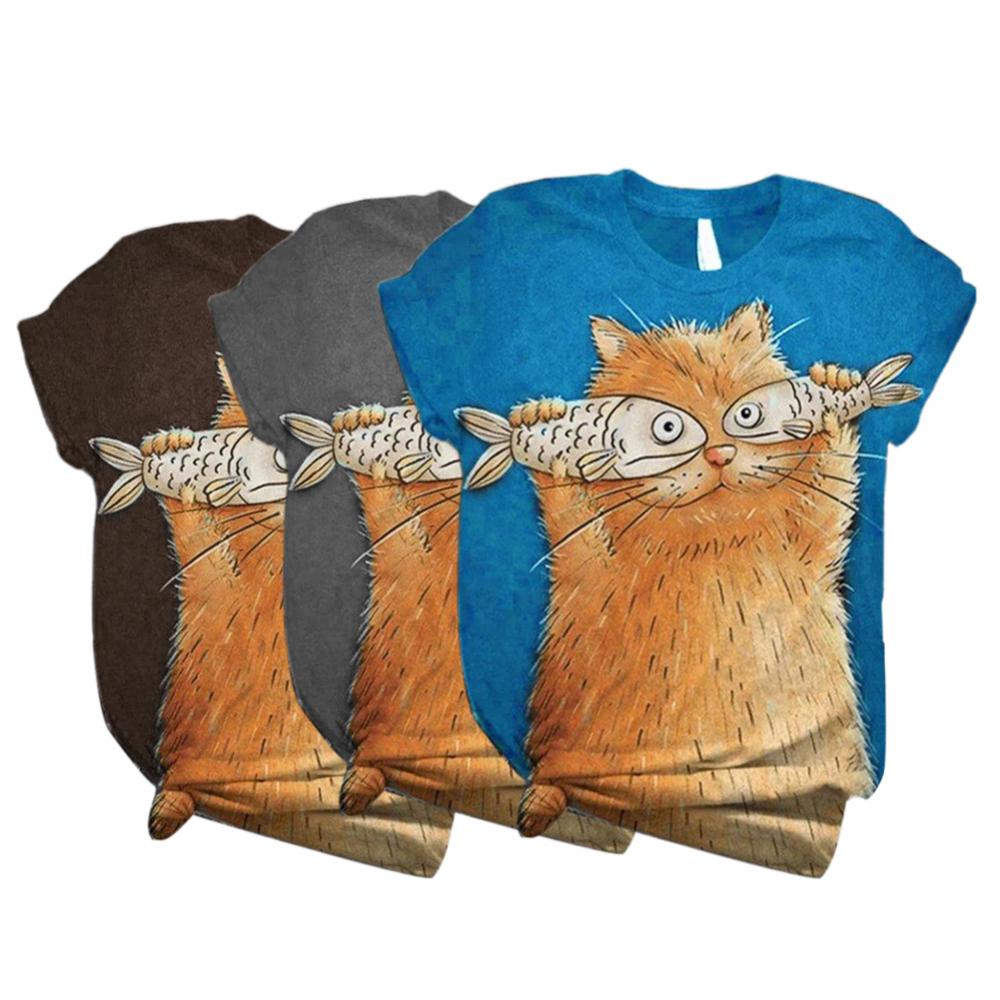 Harajuku женские футболки, Женская Повседневная летняя Свободная блузка с круглым вырезом и коротким рукавом с принтом кошки и рыбы, футболка, топ, толстовка, оверсайз