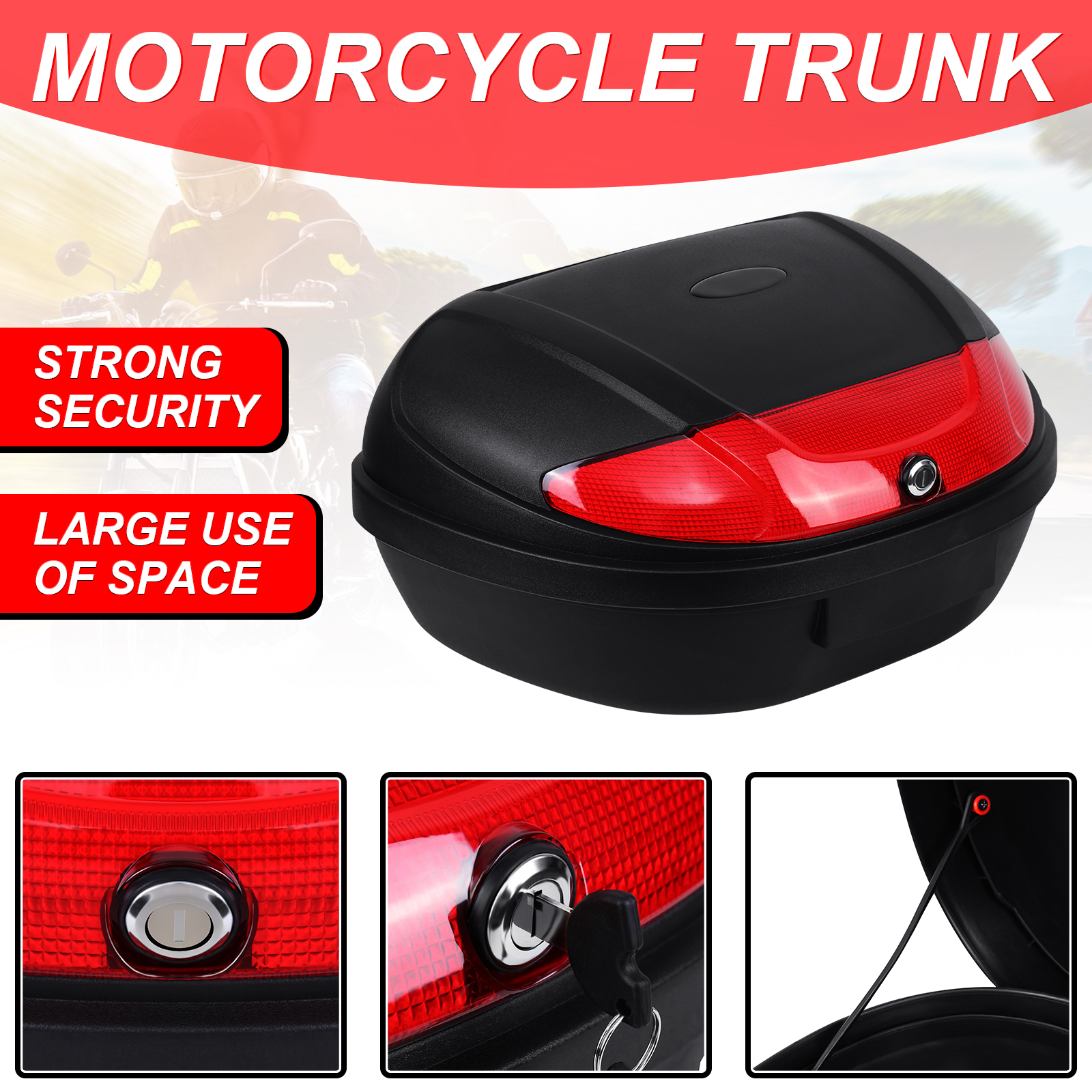 (1) 52 л большой емкости, может вмещать 2 мотоциклетные шлема, импортные PP инженерные пластмассы полностью формованы, прочные и устойчивые к падению, ударопрочности, царапинам и царапинам;