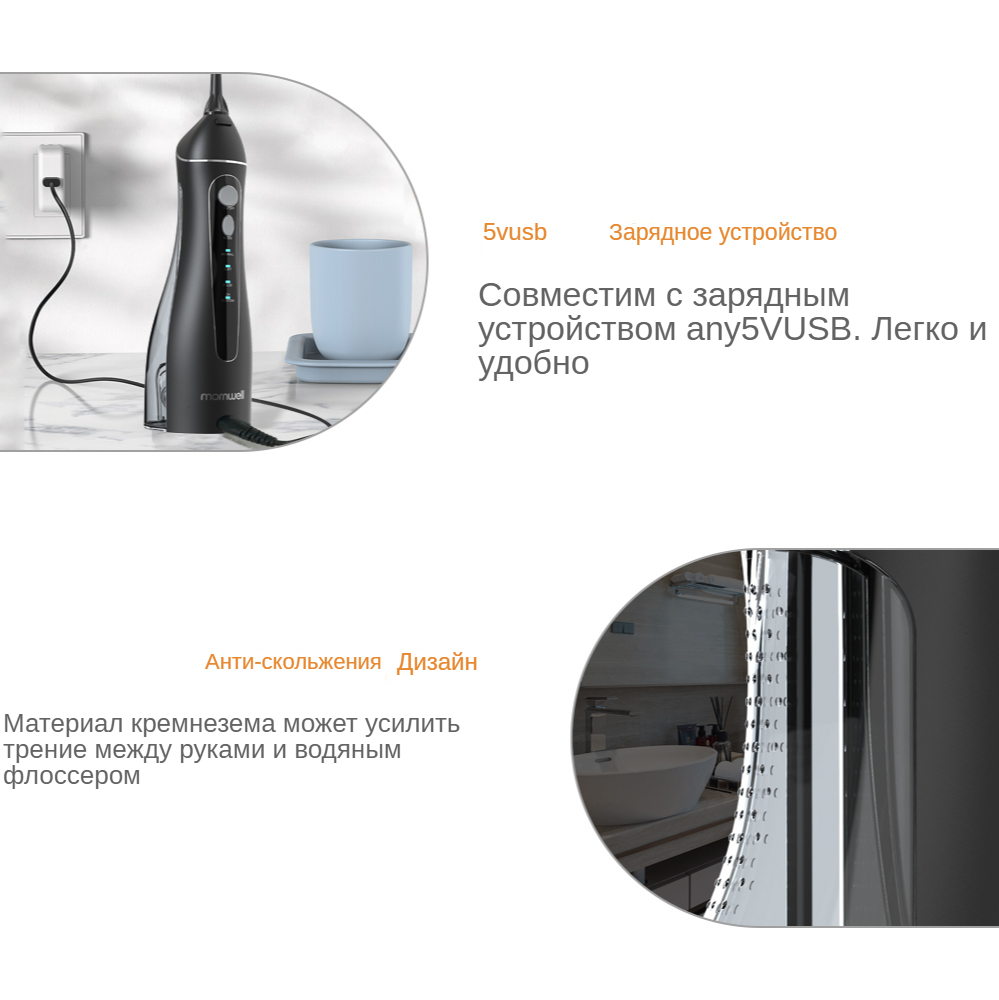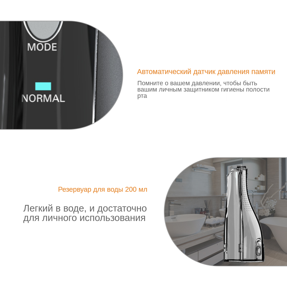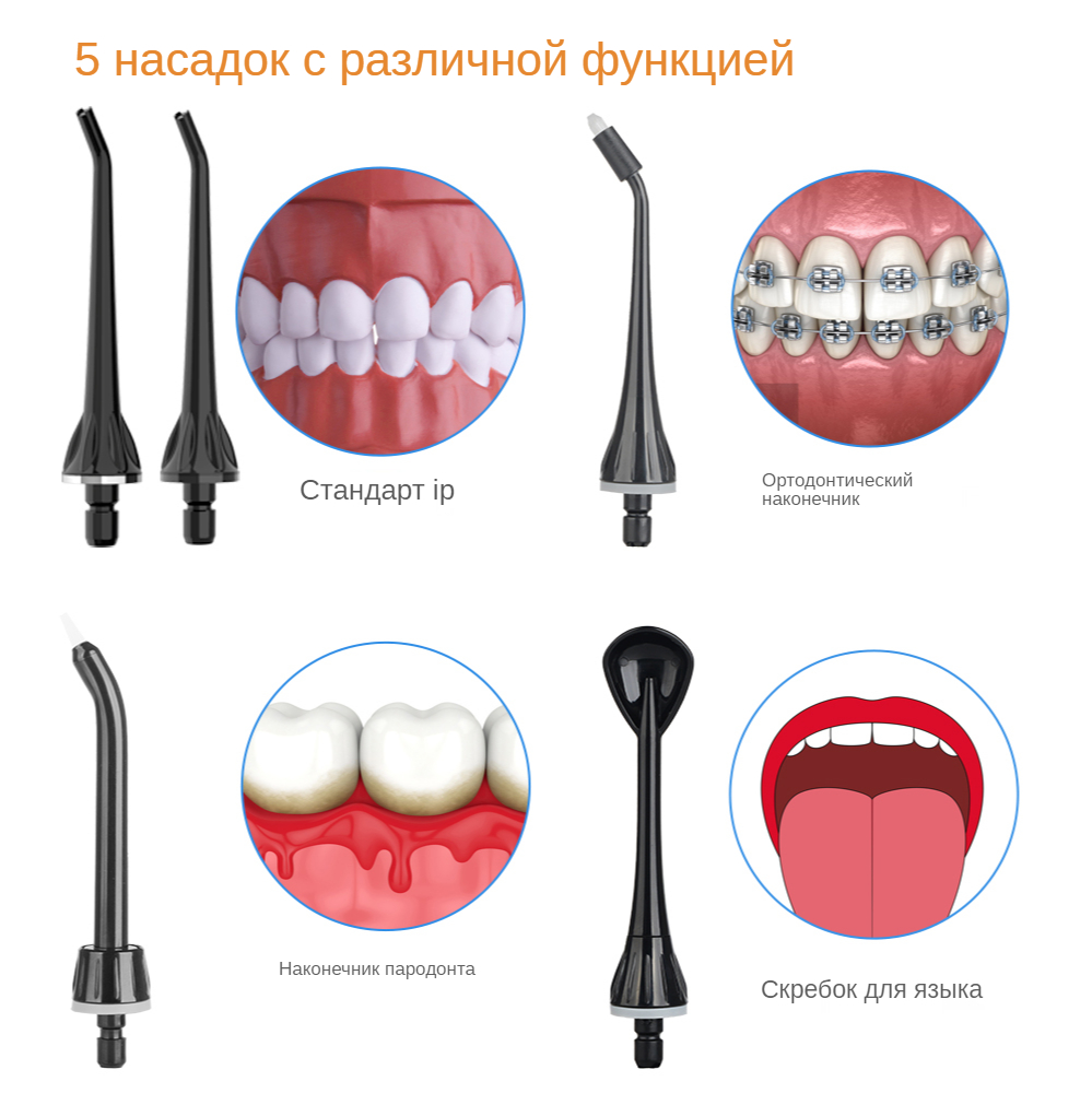 5. Характеристики: многофункциональный/IPX7 водонепроницаемый/3 регулируемых режима работы/сильное давление воды/удобная портативная зарядка через USB/Съемный резервуар для воды большой емкости 200 мл/5 различных функций насадок, 1 х щетка для чистки/вращающиеся на 360 ° насадки/уникальный дизайн гравитационного шара/водонепроницаемый разъем и пылезащитная конструкция штекера