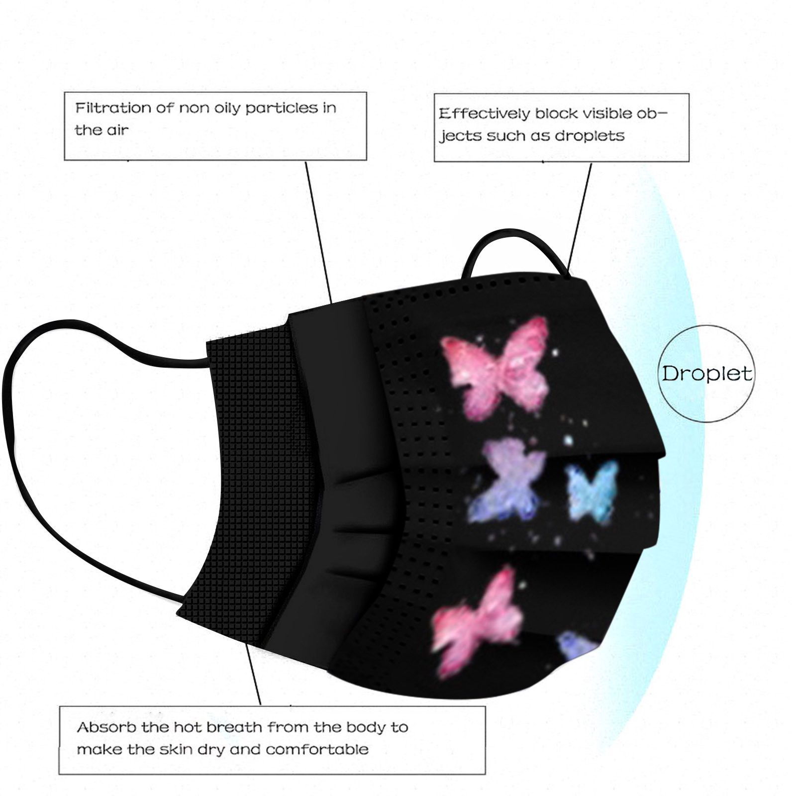 3 слоя Нетканая одноразовая маска изготовлена из 3 слоев нетканого материала, он безопасен для здоровья и безопасный для вас, чтобы использовать. Дышащий материал и милые узоры, что делает его полезным и модным. Специальный 3 слоя из нетканого материала, дизайн, обеспечивает некоторые меры защиты от пыли, автомобильный отходящий газ, пыльцу и т. Д. Эластичная петля уха позволяет легко снимать и надевать цепочку и не давит на уши. Маникюрный салон или любые другие области, где может потребоваться защита