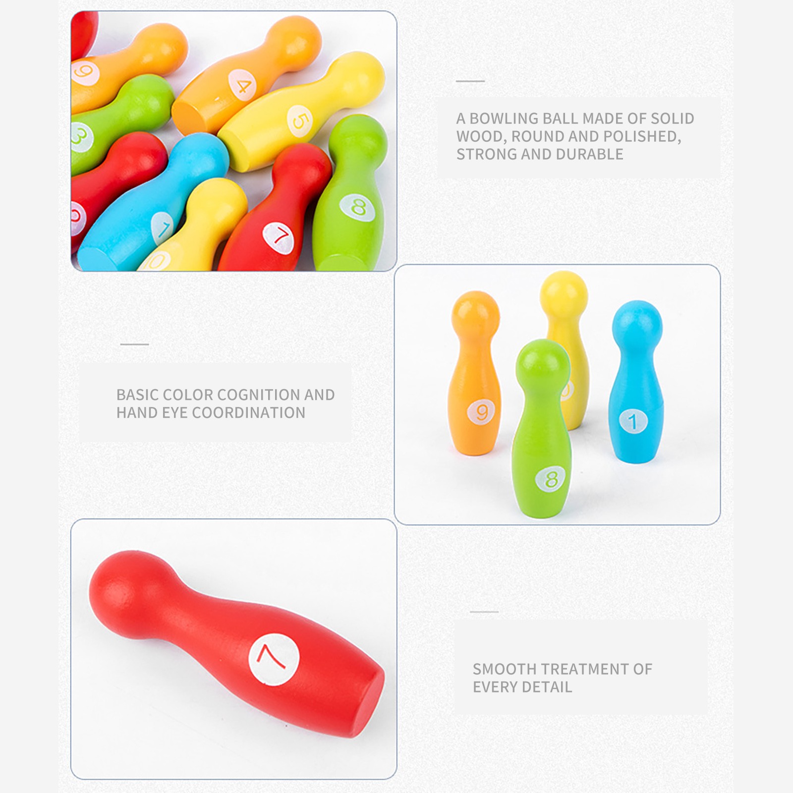 Способность осуществлять координацию тела: улучшает гибкость тела и балансирует способность через Боулинг Цветовое познание цвет просветления: поучение цветового познания детей помогает детям лучше познавать цвет Хороший помощник для самостоятельного развлечения: цифровая Когнитивная игра, боулинг формирование упражнений рук мышечное использование Упражнения для рук и глаз: детские упражнения для рук и глаз, координацию и баланс, игра в боулинг Твердая древесина для прочной и прочной: твердая древесина делает деревянную структуру однородной, тонкой, прочной и не легко взломать Мульти-процесс округлости шлифовки: шлифовка округлости, тонкость, отсутствие заусенцев, чтобы убедиться, что каждый из них гладкий и округлостиУпаковочный лист: