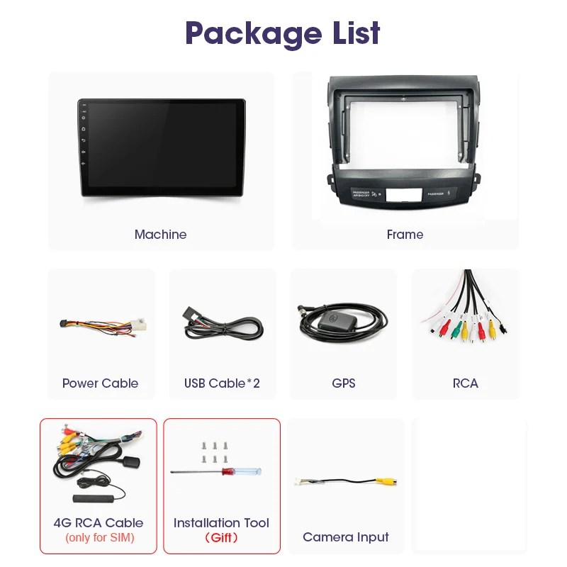 1 x Car Android Player, 1 x GPS Antenna, 1 x New Power Harness, 1 x Old Power Harness, 1 x Radio Antenna Adapter, 2 x USB Cable, 1 x English User Manual, 1 x RCA Input / Output Cable, 1 x Camera Input Cable