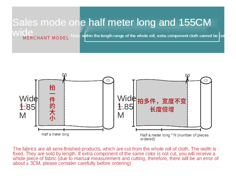 Order "50pieces" = whole piece: 50meter *1.55meter