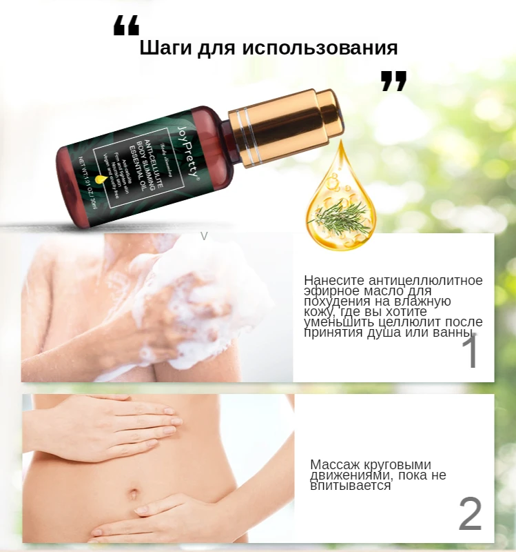 1. Нанесите антицеллюлитные эфирные масла для похудения на влажную кожу, где вы хотите уменьшить целлюлит после принятия душа или ванны;