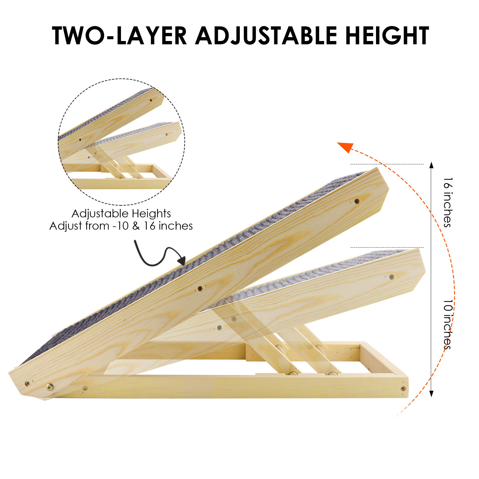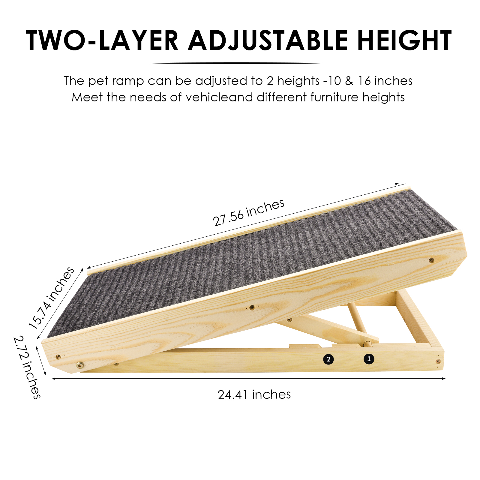 Регулируемая высота:Наклон пандуса имеет 2 регулируемые высоты на 10 и 16 дюймов (25-40 см), длина пандуса 27,56 дюйма (70 см), широкий 15,74 дюймов (40 см);