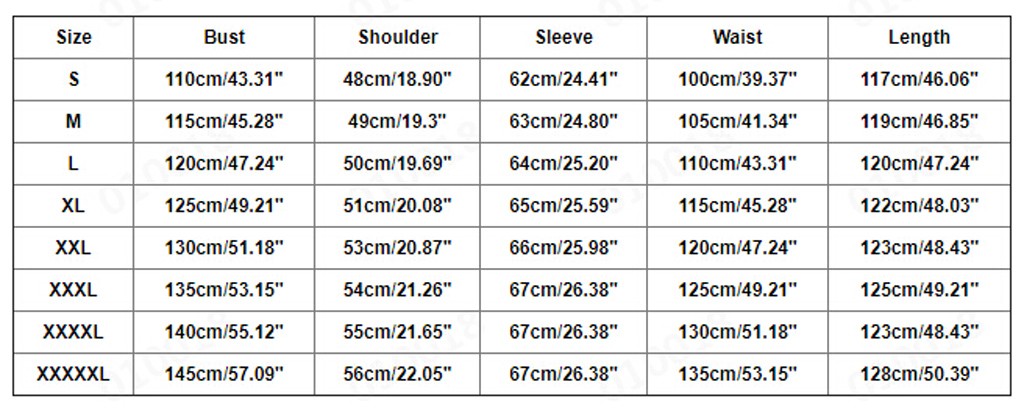 Размеры Бюст Плечо Рукав Талия Длина S 110 см/43,31'' 48 см/18,90'' 62 см/24,41'' 100 см/39,37'' 117 см/46,06'' М 115 см/45,28'' 49 см/19,3" 63 см/24,80'' 105 см/41,34'' 119 см/46,85'' L 120 см/47,24'' 50 см/19,69'' 64 см/25,20'' 110 см/43,31'' 120 см/47,24'' XL 125 см/49,21'' 51 см/20,08'' 65 см/25,59'' 115 см/45,28'' 122 см/48,03'' XXL 130 см/51,18'' 53 см/20,87'' 66 см/25,98'' 120 см/47,24'' 123 см/48,43'' XХХL 135 см/53,15'' 54 см/21,26'' 67 см/26,38'' 125 см/49,21'' 125 см/49,21'' XXXXL 140 см/55,12'' 55 см/21,65'' 67 см/26,38'' 130 см/51,18'' 123 см/48,43'' XXXXXL 145 см/57,09'' 56 см/22,05'' 67 см/26,38'' 135 см/53,15'' 128 см/50,39''Продавец - полный отстой. Кому не жалко своего времени - обращайтесь. Продавец сначала тянул время с отправкой, затем очень долго... Читать отзыв полностью...