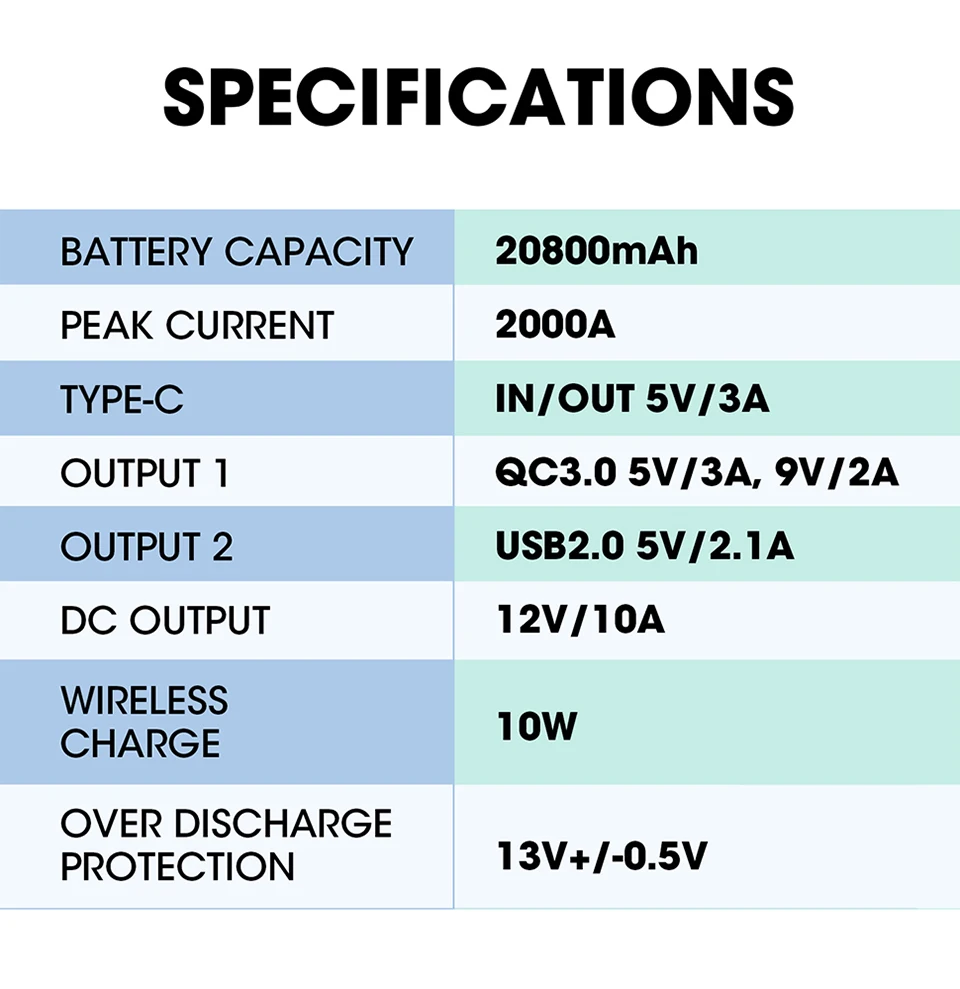 Упаковано с быстрой зарядкой 3. 0 usb-порт и 10 Вт беспроводной зарядки, с емкостью 20800 мАч, быстрее заряжает ваши устройства и совместим с почти умными устройствами-включая сотовые телефоны, планшеты, AirPods, или цифровые камеры и т. Д. Порт Type-C in/out может поставлять быструю зарядку для себя и другой электроники. Выходной порт постоянного тока 12 ~ 15 в 10 А может удобно заряжать автомобильные воздушные насосы, автомобильные пылесосы и другие автомобильные аксессуары. Сверхъяркий светодиодный вспышка светильник с тремя светильник режимов непрерывно обеспечивает светильник до 72 часов для различных чрезвычайных ситуациях, предотвратить вас от застревания в дикой природе в темное время суток.