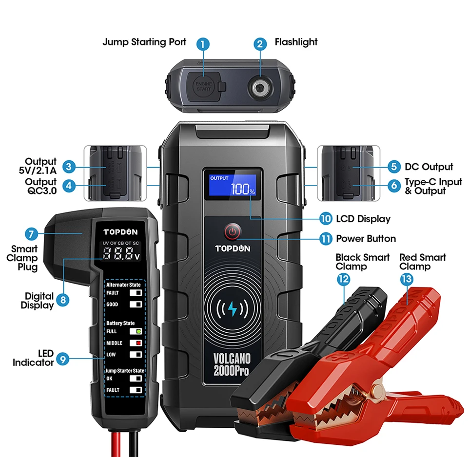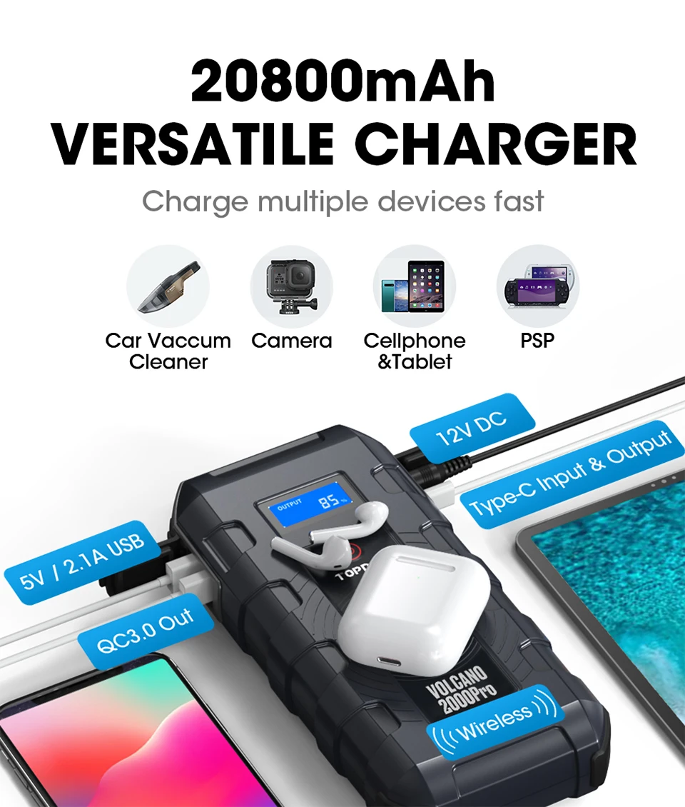 Это автомобильный стартер, портативный внешний аккумулятор, зарядное устройство и светодиодный фонарик. V2000 pro jump starter может одновременно заряжать 4 устройства. Аккумулятор емкостью 20800 мА · ч может заряжать ваши телефоны, планшеты и камеры через порт QC3.0, usb-порт 5 В/2,1 А и порт 5 В/3 А Type-C. Зарядка устройств с поддержкой Qi с беспроводной зарядкой 10 Вт. Питание 12 в автомобильных устройств через преобразователь постоянного тока в прикуриватель. Встроенный три светильник режимов Светодиодный вспышка светильник можно ознакомиться с дополнительной безопасности и удобства.