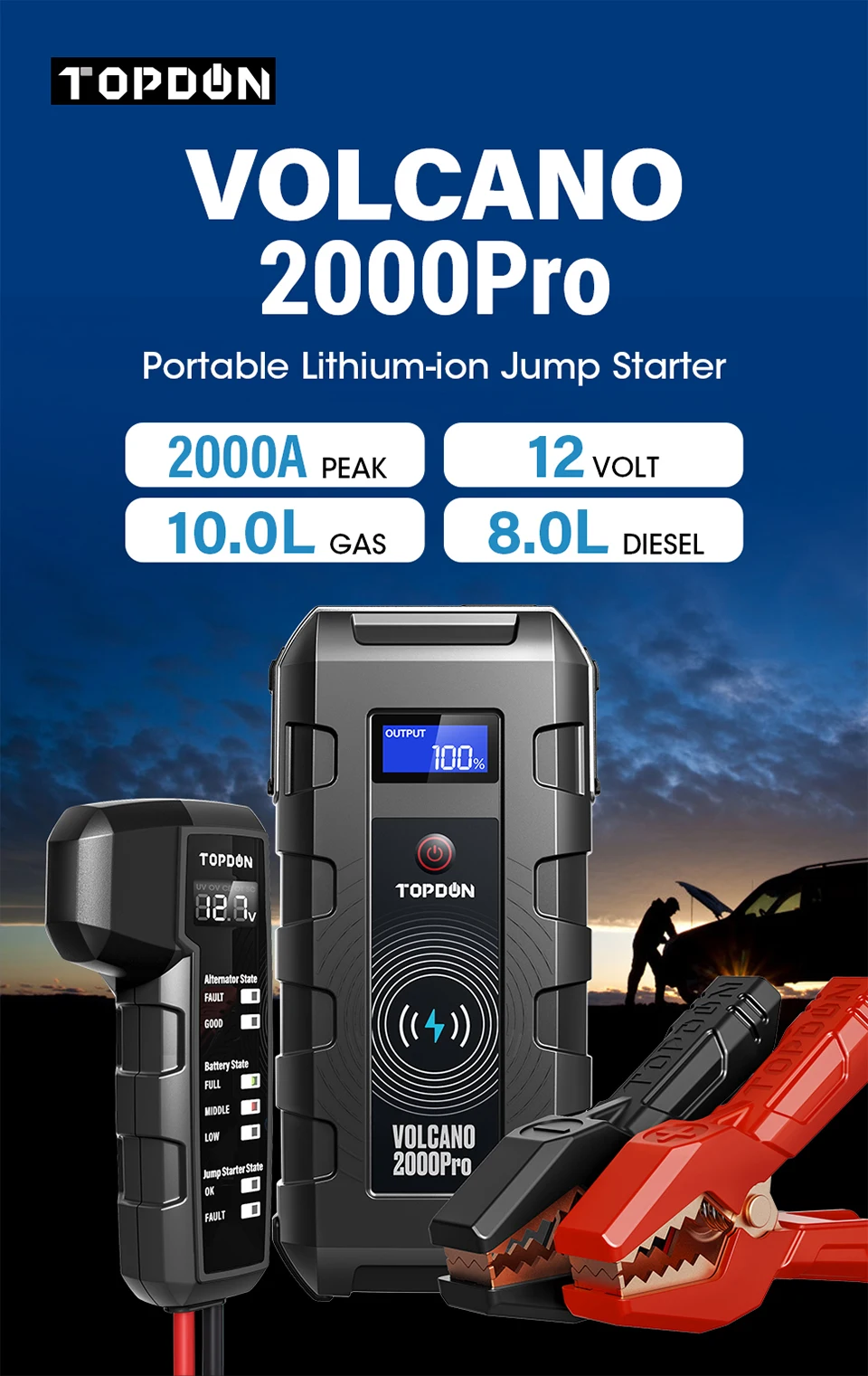 TOPDON V2000 профессиональная портативная трансформируемая Пусковое устройство для стартера способен начиная все 12V батареи за считанные секунды до 10.0L газа и 8.0L дизельных двигателей. Он может прыгать Старт 12V автомобилей, грузовиков, фургонов, пикапов, квадроциклов, внедорожников, косилок, яхты, мотоциклов, снегоходов, водных средств или морских лодок до 25 раз на полную зарядку. Это спасатель для кемпинга, улицы, чрезвычайных ситуаций и дорожных поездок.