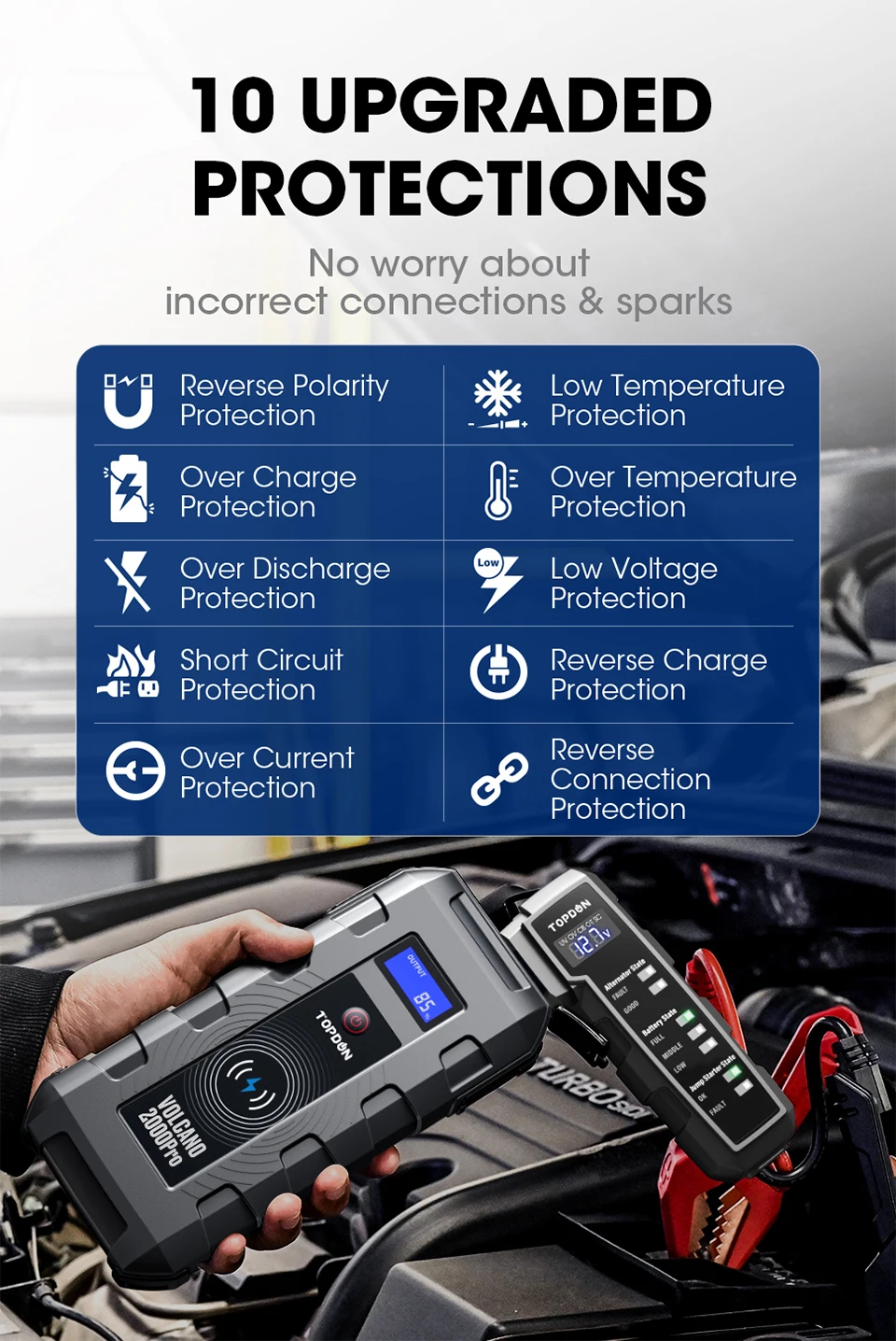 Премиум медные зажимы и 10 защитных защит делают V2000 автомобильный стартовый аккумулятор безопасным для любого использования. Запуск вашего автомобиля, не беспокоясь о искрах, если он подключен неправильно. Этот стартер прошел все UL2743, FCC, CE, PSE и ROSH правила. Защита включает защиту от обратной полярности, защиту от обратного подключения, защиту от перезаряда и перезарядки, защиту от короткого замыкания и многое другое.