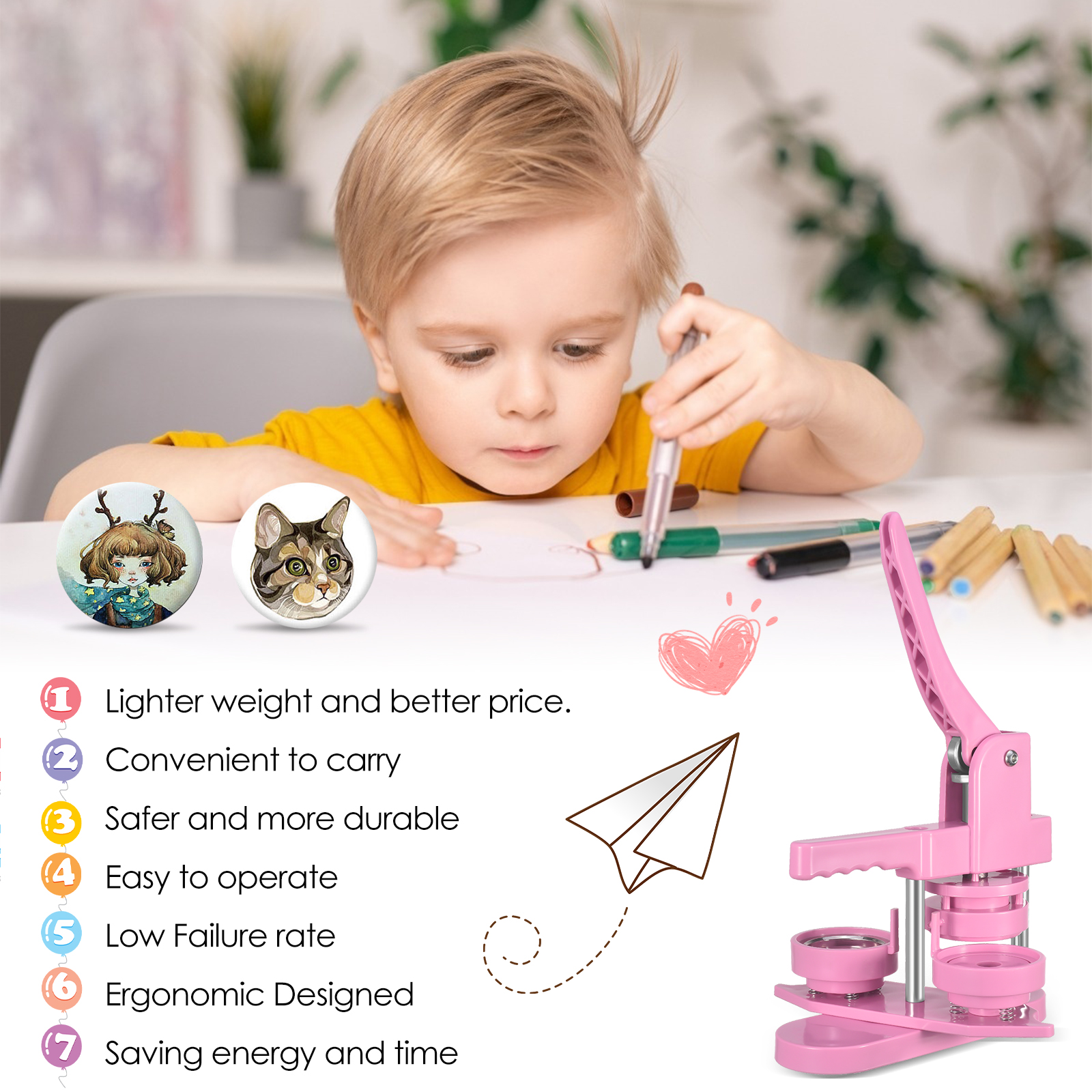 �� Легкий и стабильный: по сравнению с металлическими значками, эта машина легче и менее ржавеет. Модернизированное позиционирование устройство не только повышает эффективность и точность, но и помогает лучше позиционировать. Безопасность также была улучшена, и она более удобна в использовании и гарантирует, что ваши значки выйдут именно так, как вы ожидаете. Он очень подходит для людей с низкой энергией и даже детей.