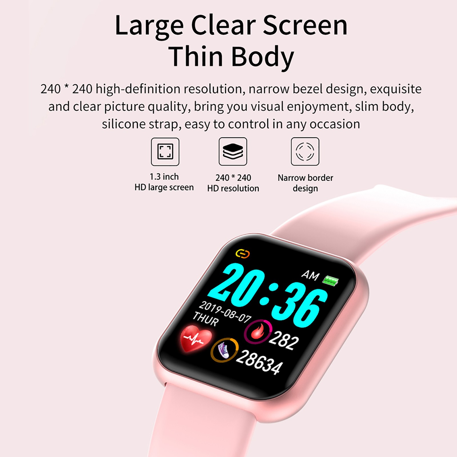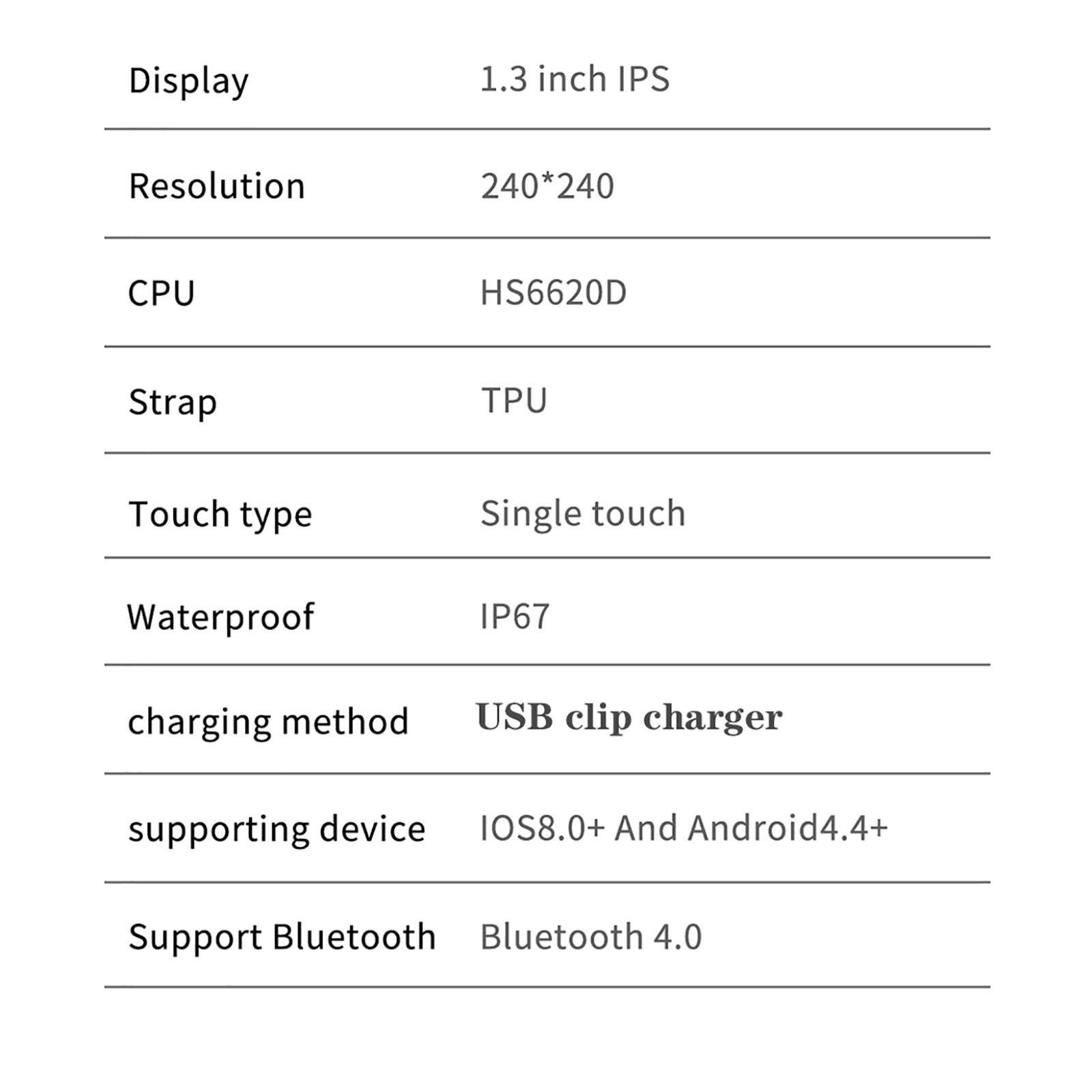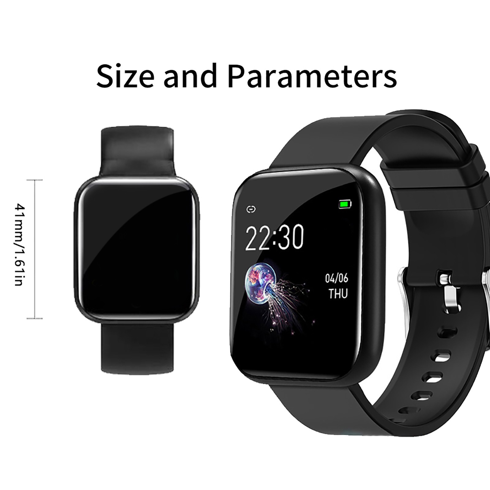 Fuselage size: 41 * 34 * 10mm Display size: 13inch Screen resolution: 240 * 240 Battery capacity: 170mAh Fuselage material: zinc alloy electroplating Strap material: TPU Charging mode: charging clip Functions: time display, step counting, calories, distance, movement mode, hand up screen, sleep monitoring, running track, call reminder, message reminder, sedentary reminder, alarm clock reminder, do not disturb mode, shake to take pictures, look for bracelet, dial switch, long press touch, weather, dial Chinese and English, whole point measurement, wechat exercise, heart rate, blood pressure, blood oxygen, apple health Health weekly, Bluetooth name, etc Internal inclusion: 1PC watch1PC charging line