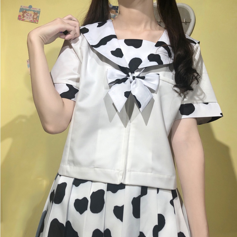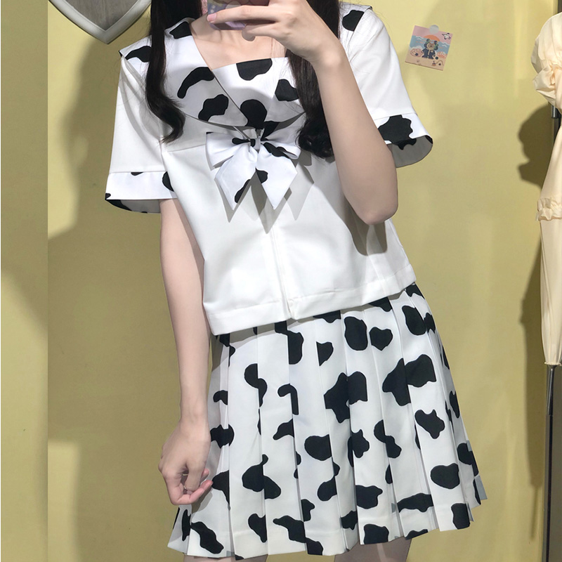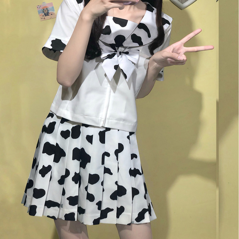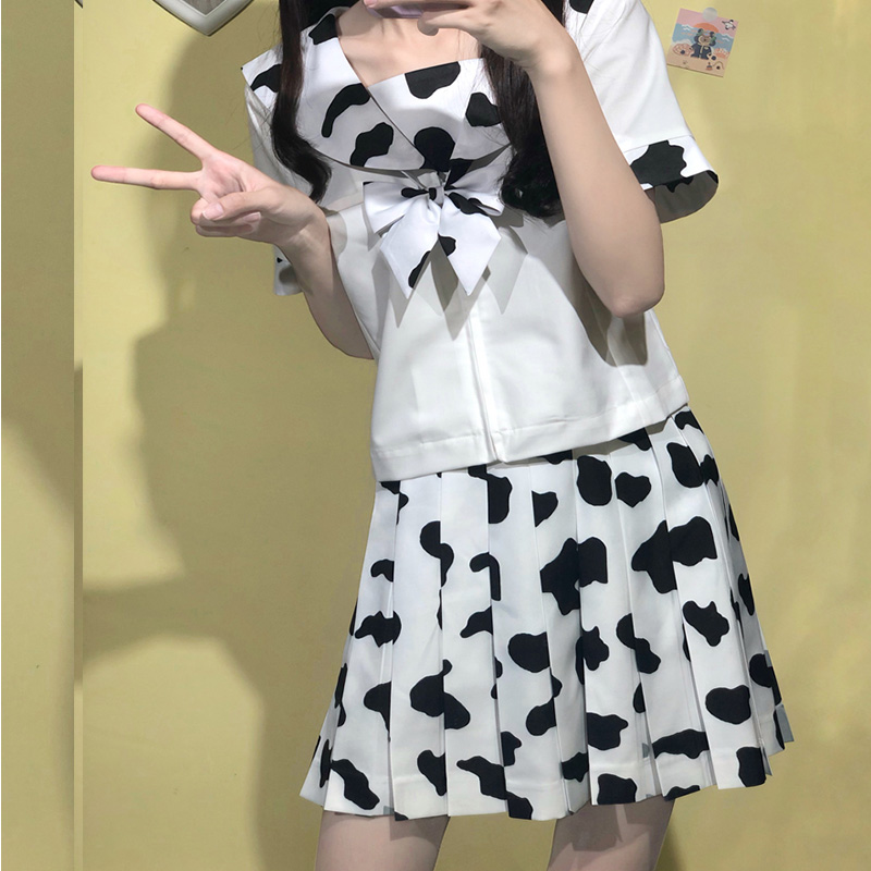 Cow Print Women 2 Piece Set Kawaii Woman Skirts Suits Harajuku Chic Female Pleated Skirt and Tops Sets Preppy Style Lady Outfits