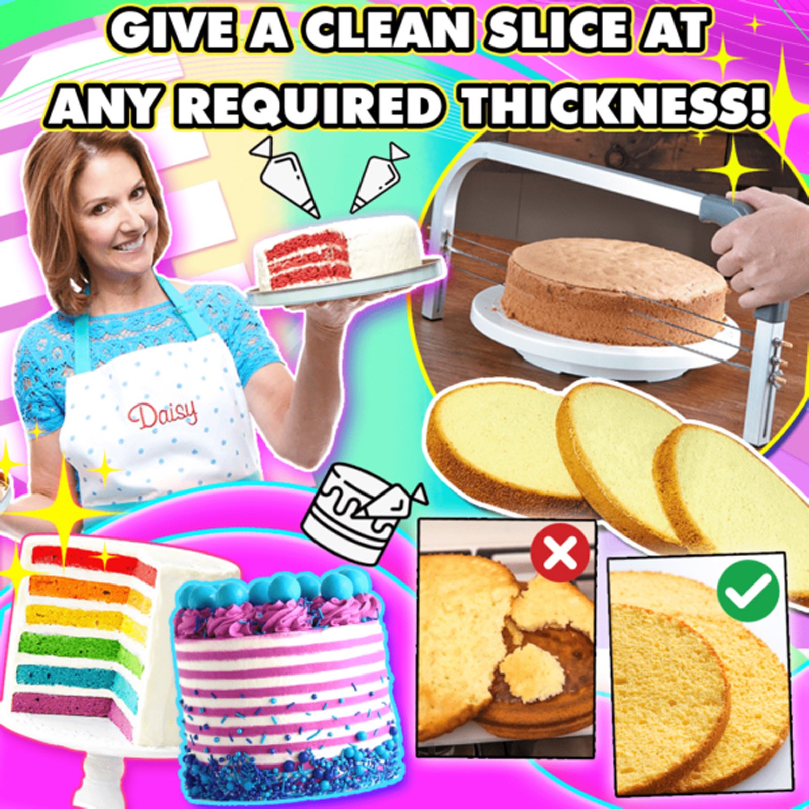 Cortador de tartas resistente y afilado, permanece lo supicientemente apretado y mantiene la cuchilla en todo el lugar, se limpia muy fagilmente. Нет necesidad de quitar un cable No necesario, simplemente levantalo a la parte Улучшенный fuera del camino. Se corta directamente a través de, bien hecho y ajustable, puedes recortar y tortar al mismo tiempo. Excelente cortador de tartas, hace que sea mаs fаcil cortar tartas, altura matima de corte de 0,394 в 4,331 в aproximadamente parte превосходном de corte. , torta multiples capas al mismo tiempo y corta muy bien! Muy resistente, totalmente ajustable, perfecto para cualquier tamaño de tarta, sin duda sugeriria cualquier panadero. Las cuchillas son afiladas, por lo que debes tener mucho cuidado de usar con precaución. Este un cortador de pan de grado profesional. Limpia las cuchillas cuidadosamente y cuélgalas fuera del alcance excepto por personas adultas muy altas que ayudan con el alcance. Mantenlas alejadas de niños y bebés.Материал: сталь и пластик.