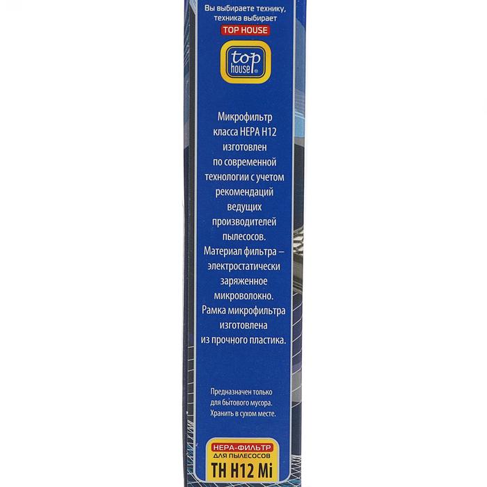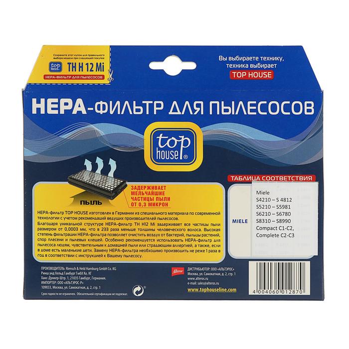 НЕРА-фильтр Top House 12870 TH H12 Mi изготовлен в Германии из специального материала по современной технологии с учетом рекомендаций ведущих производителей пылесосов. Благодаря уникальной структуре НЕРА-фильтр задерживает все частицы пыли размером от 0,0003 мм, что в 233 раза меньше толщины человеческого волоса. Высокая степень фильтрации позволяет очистить воздух от бактерий, пыльцы растений, спор плесени и пылевых клешей. Особенно рекомендуется использовать НЕРА-фильтр для пылесоса людям, чувствительным к домашней пыли или страдающим аллергией, а также, если в доме есть маленькие дети. Замену НЕРА-фильтра необходимо производить не реже 1 раза в год в соответствии с инструкцией к вашему пылесосу. Для пылесосов Miele S4210 – S4812, S5210 – S5981, S6210 – S6780, S8310 – S8990, Compact C1-C2, Complete C2-C3.