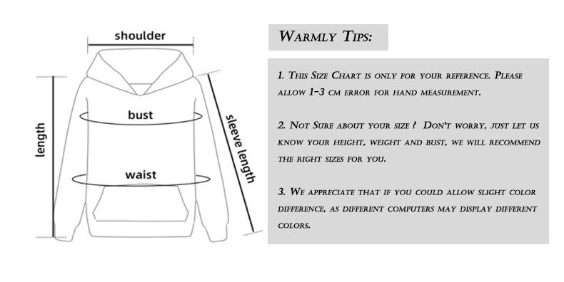 Примечание: Размер толстовки в нашем магазине соответствует европейскому размеру. Пожалуйста, выберите одежду вашего размера в соответствии с длиной и шириной толстовки. Если у вас есть какие-либо вопросы, пожалуйста, свяжитесь с нами.