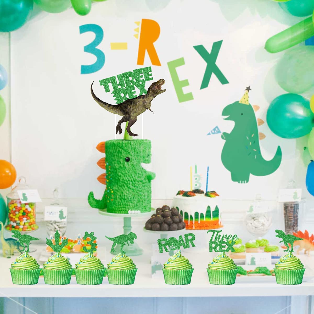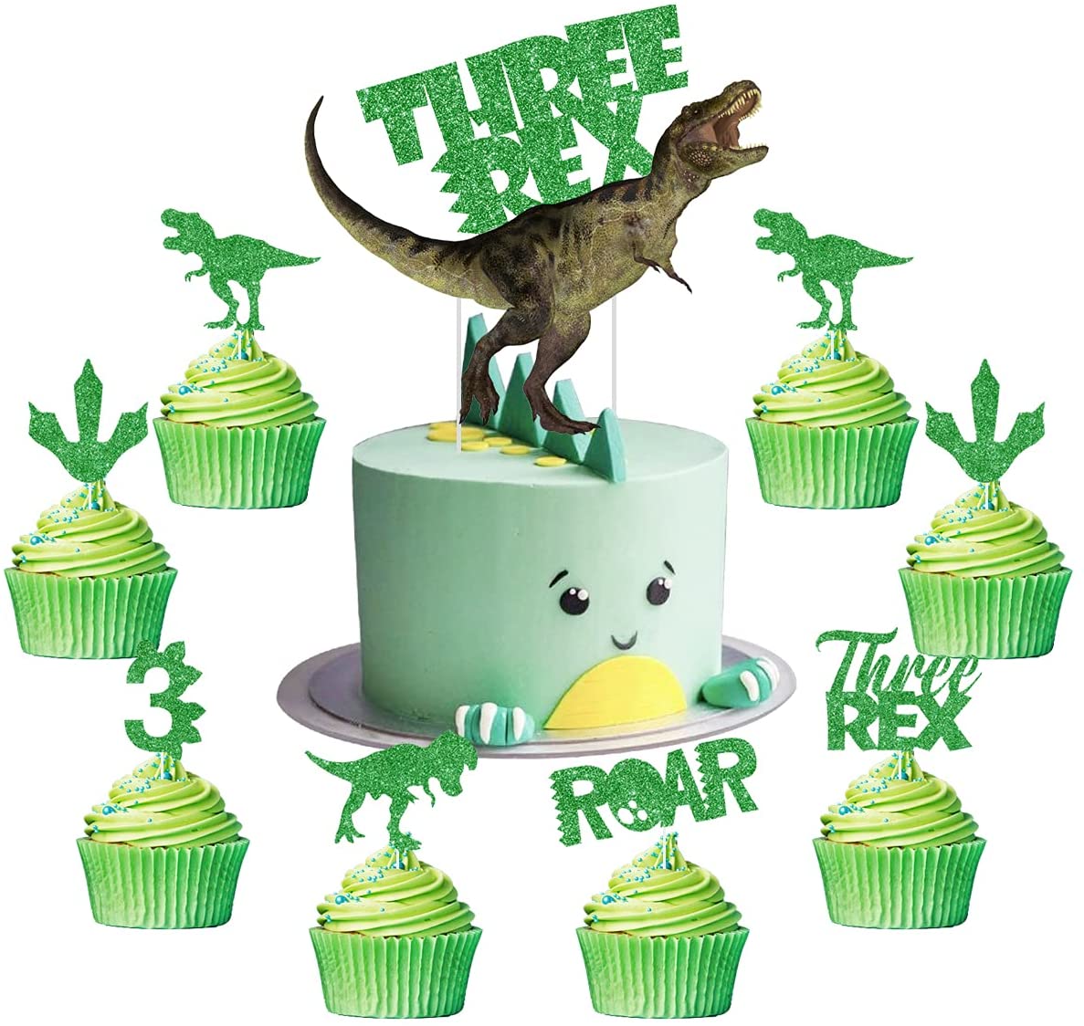 Три Рекса День Рождения украшения: 1 набор динозавра три Рекса торт Топпер; 24 блестящая бумага зеленый динозавр 3 года кекс топперы торт Топпер s.