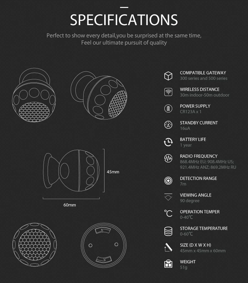 PIR is a passive infrared detector or physical sensor.the sensor doesn't emit any energy but only passively receive and detect infrared radiation from outside.under room temperatur.all items have radiation.Human beings are warm-blooded animal with stable infrared radiation.are most easily to be detected.That's why we also call it body snsor.PIR send messages via Z-wave network to the Z-wave mail controller.In the Z-Wave network communications.PIR can be connected to any Z-wave main controller.different countries or areas.the radio frequency is different of the Z-wave main controller.different countries or areas.the radio frequency is different of the Z-wave network.In the communication between the PIR and Z-wave main controller.PIR can only send messages,not be able to receive messages.When the PIR is triggered.PIR will send messages to the Z wave main controller.and associate devices to work through the z wave main controller.The PIR is battery powered,is small and con be installed easilySpecifications: