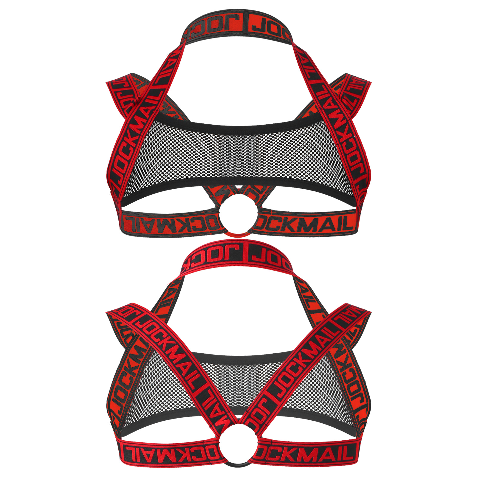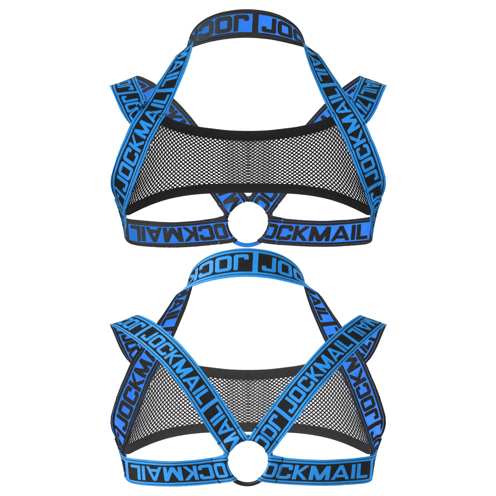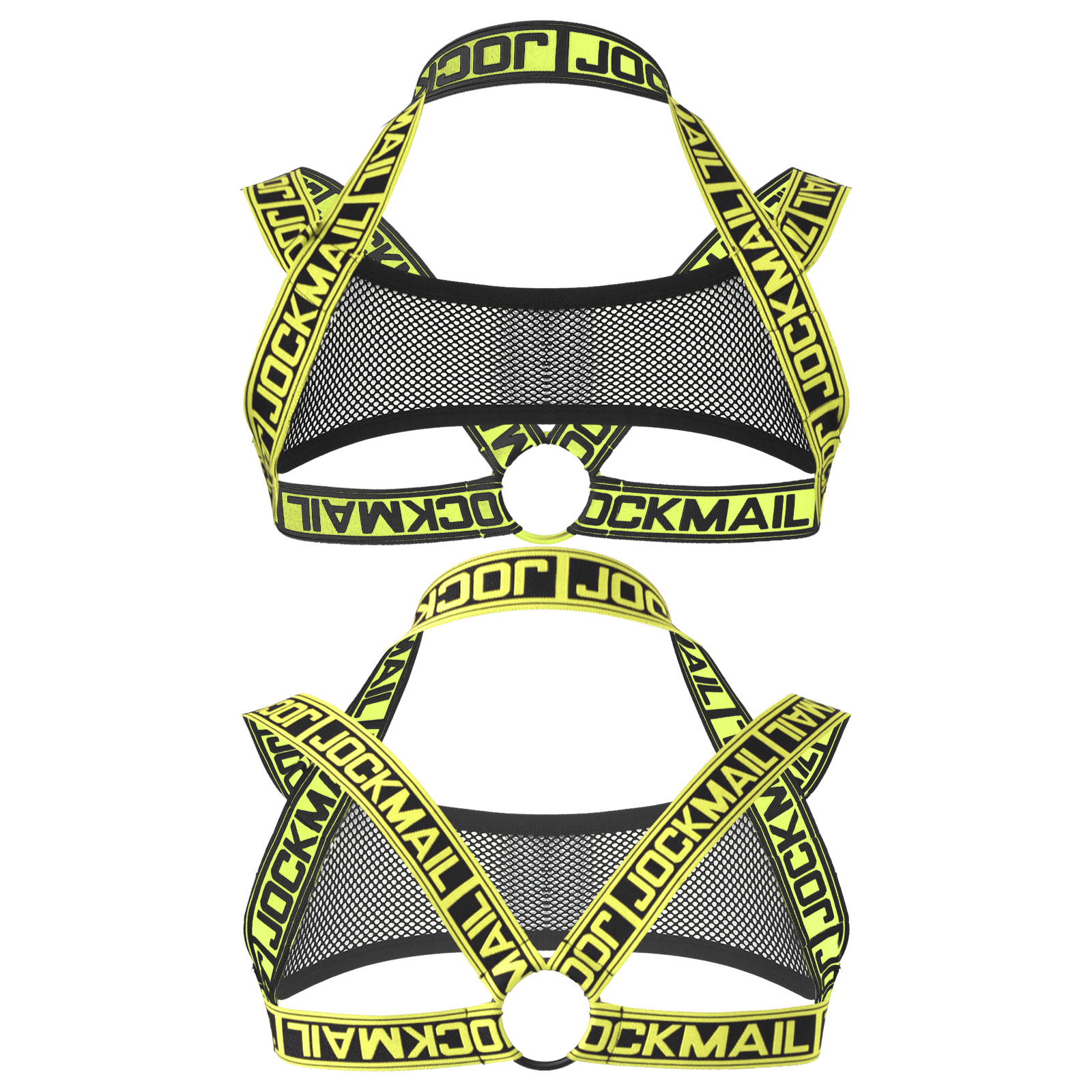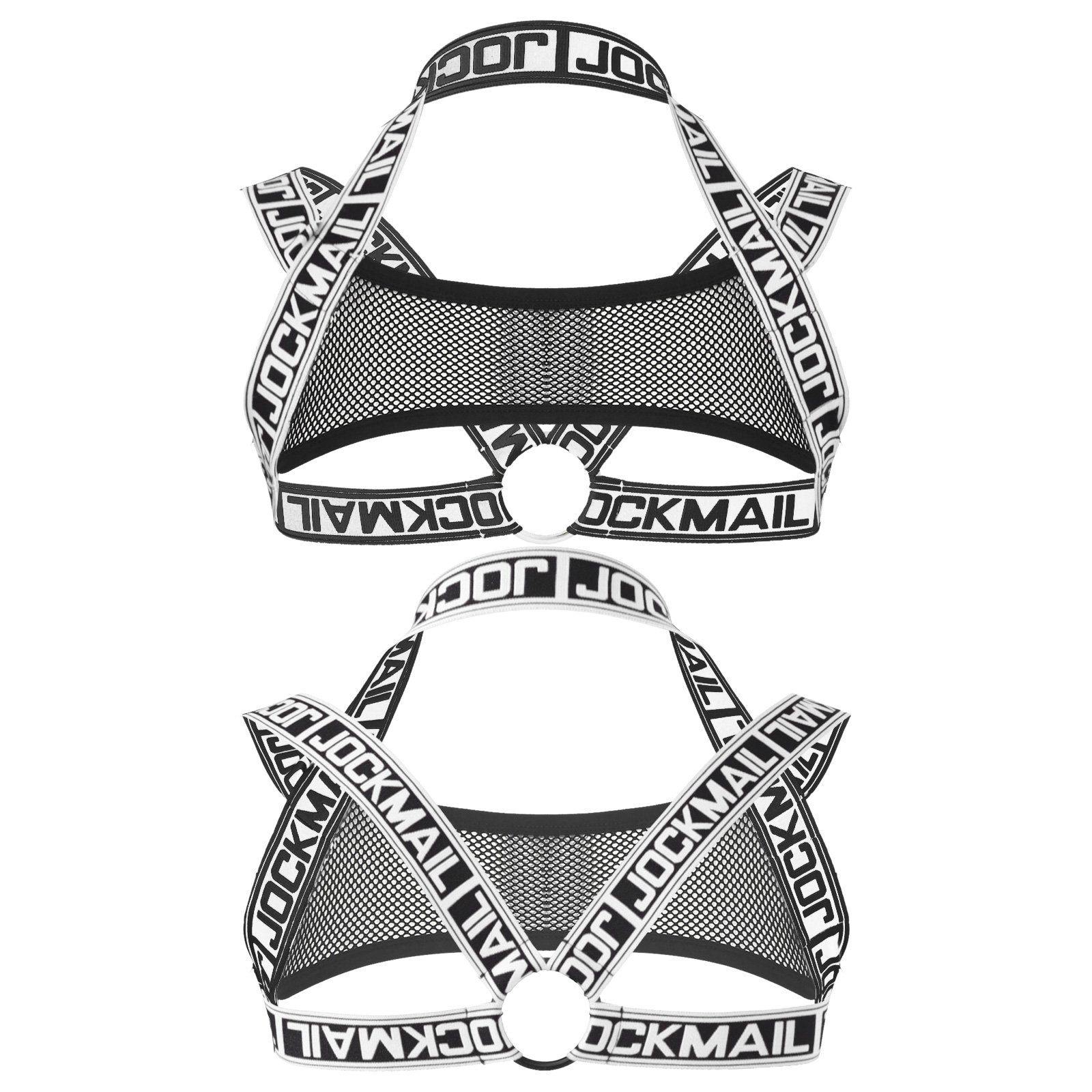 Благодаря прозрачной сетке спереди, эластичным лямкам с буквенным принтом, украшенным круглым кольцом.