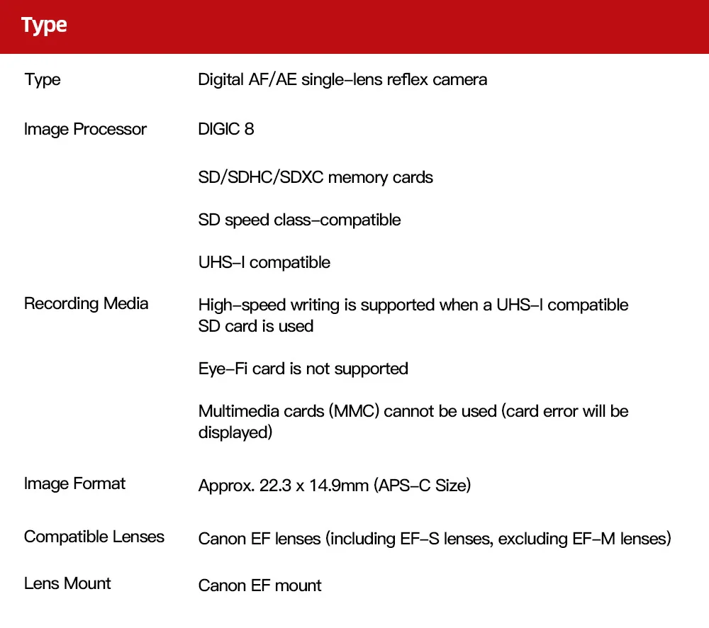 EOS Rebel T8i-идеальное представление к камере со сменным объективом или для тех, кто ищет доступное обновление. Оснащен 24,1 мегапиксельным cmos-сенсором (APS-C), процессором обработки изображений DIGIC 8 и диапазоном ISO 100-25600 (возможность расширения до 51200 **), EOS Rebel T8i-это наша Самая передовая камера EOS Rebel, которая обеспечивает высокое качество изображения и видео. Снимаете ли вы простые моменты с друзьями или семьей или снимаете Быстро движущиеся предметы, такие как домашние животные или спортсмены, поддерживайте плавную и точную фокусировку с помощью высокоскоростной непрерывной съемки камеры до 7 кадров в секунду (до 7,5 кадров в секунду во время съемки в режиме реального времени). Разработан с интуитивно понятный технология распознавания этой мощной камерой (также распознает и по-прежнему заблокированы на ваш вопрос со своим 45-точечная все перекрестного типа AF система * EOS iTR AF (Распознавание лиц) во время съемки видоискателя и автофокусировки для обнаружения глаз во время съемки в режиме реального времени. Камера EOS Rebel T8i с поддержкой 4K 24p и вертикальной поддержки видео, а также встроенный Wi-Fi для vloggers или социальных сетей®*** И Bluetooth®^ Технология, что позволяет легко поделиться всем, что вы захватываете. В сочетании с сенсорным ЖК-экраном с диагональю 3,0 дюйма и широким спектром усовершенствованных элементов управления EOS Rebel T8i готов вдохнуть новую жизнь в ваше творчество.