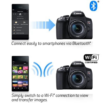 Bluetooth®^ Сопряжение помогает подключить камеру EOS Rebel T8i к совместимым умным устройствам с помощью бесплатного приложения Canon camera Подключите. Беспроводное соединение с низким энергопотреблением помогает сохранить срок службы батареи, обеспечивая Дистанционное управление камерой. Он также отправляет постоянно обновляемые данные о местоположении GPS * 1 с вашего телефона, позволяя вам geotag то, что вы захватили, чтобы вы могли точно знать, где вы сделали это потрясающее фото отпуска.