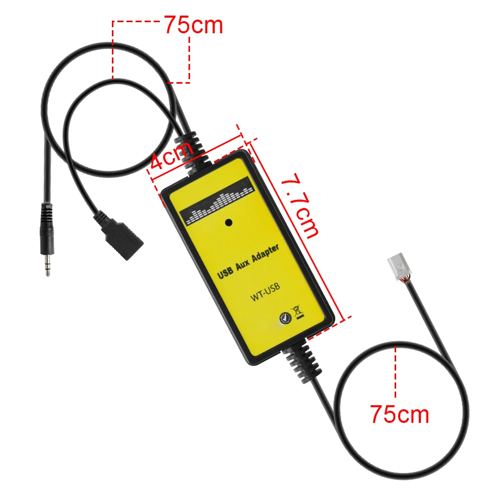 Особенности:Подключение через автомобильный CD-плеер напрямую, неразрушающая установка.Управляйте музыкой и громкостью с помощью автомобильной радиопанели или рулевого колеса.Поддержка 3,5 мм с разъемом подачи внешнего сигнала AUX входного сигнала.Высокое качество MP3/WMA декодер, пусть музыка более красивая.Без помех сигнала, нет необходимости устанавливать baterry.Умный дизайн, прост в установке и использовании.