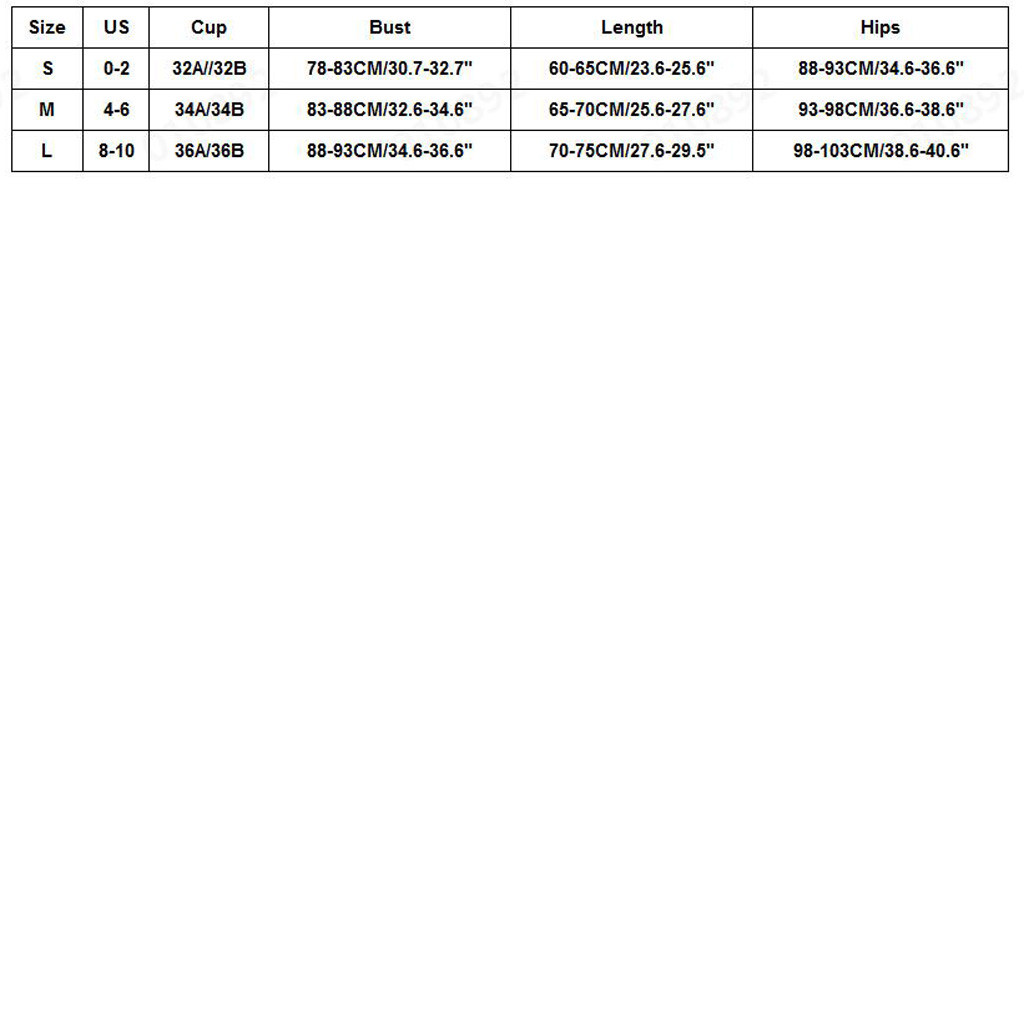 Размеры США Чашка Бюст Длина Бедра S 0-2 32A/32B 78-83 см/30,7-32,7" 60-65 см/23,6-25,6" 88-93 см/34,6-36,6" М 4-6 34A/34B 83-88 см/32,6-34,6" 65-70 см/25,6-27,6" 93-98 см/36,6-38,6" L 8-10 36A/36B 88-93 см/34,6-36,6" 70-75 см/27,6-29,5" 98-103 см/38,6-40,6"