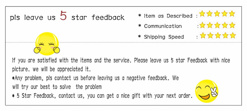 2. Если у вас есть какие-либо вопросы, или вы не удовлетворены нашей продукцией, пожалуйста, сначала свяжитесь с нами, прежде чем открывать споры и оставлять негативные отзывы, клиенты-первые, мы постараемся сделать все возможное, чтобы решить проблемы в мире.
