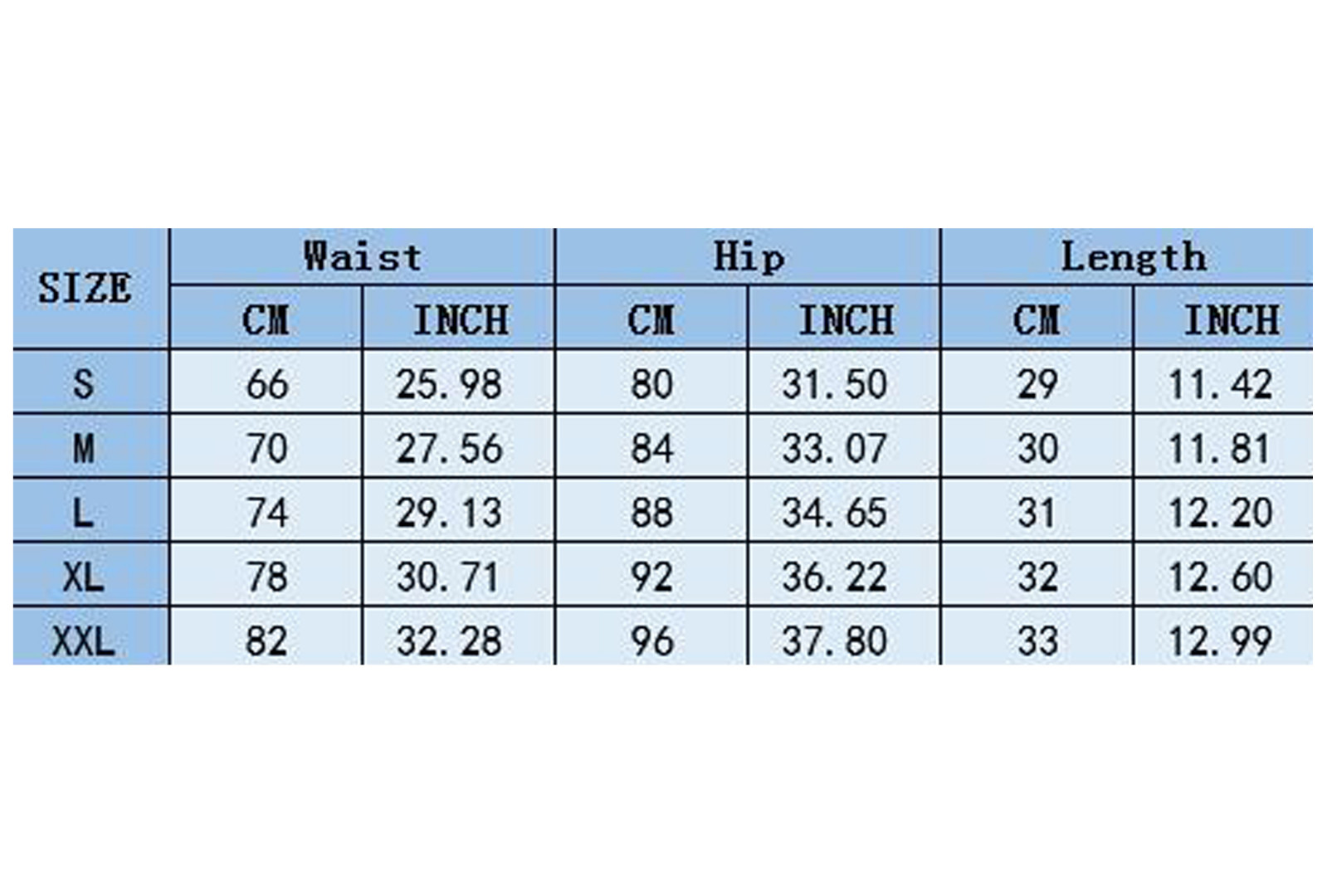 Размеры Американский размер Размер Великобритании Европейский размер Талия Бедра Длина S 4 8 32 66 см/25,98'' 80 см/31,50'' 29 см/11,42'' М 6 10 34 70 см/27,56'' 84 см/33,07'' 30 см/11,81'' L 8 12 36 74 см/29,13'' 88 см/34,65'' 31 см/12,20'' XL 10 14 38 78 см/30,71'' 92 см/36,22'' 32 см/12,60'' XXL 12 16 40 82 см/32,28'' 96 см/37,80'' 33 см/12,99''Эта очень хитрая воровка Не связывайтесь Товар получите не тот что заказывали Или брак-востановлению не подлежит Спор открыть она вам... Читать отзыв полностью...