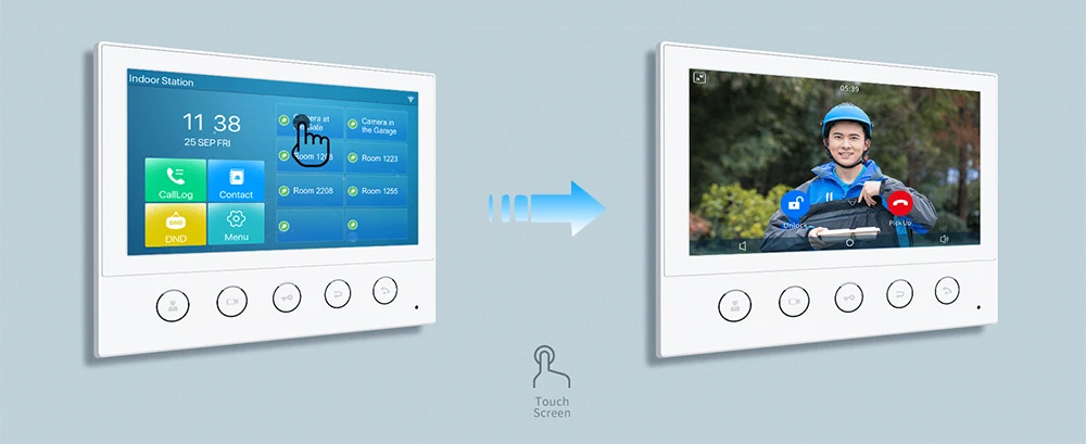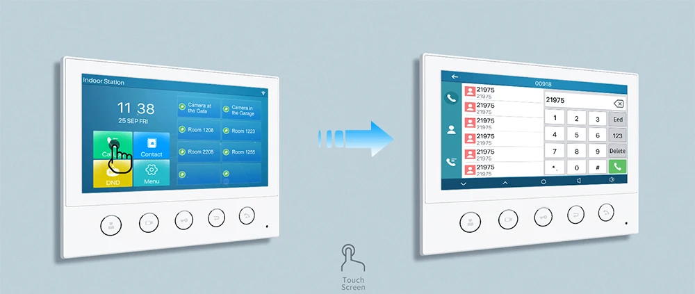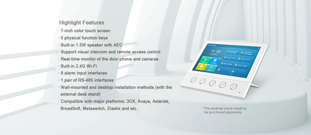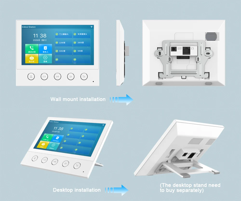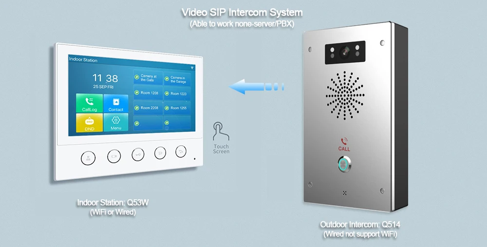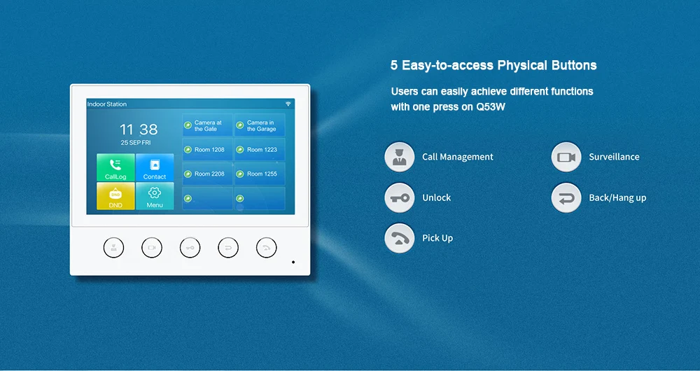 Q53W представляет собой 7-дюймовый цветной сенсорный экран SIP Крытый паяльная станция с 5 функциональных кнопок, которая может быть применена в разных Крытый сценариев. Работа с дверным телефоном и домофоном на входе