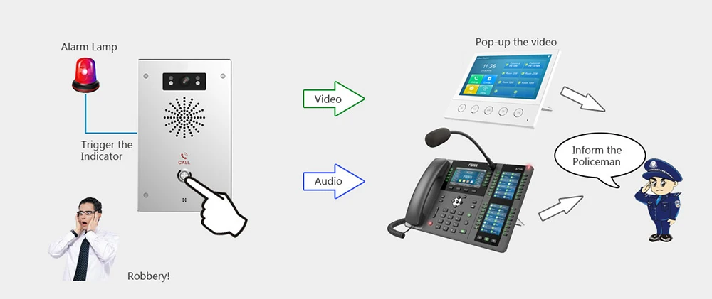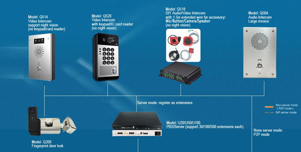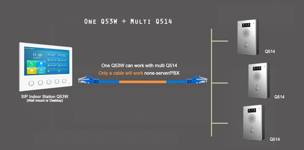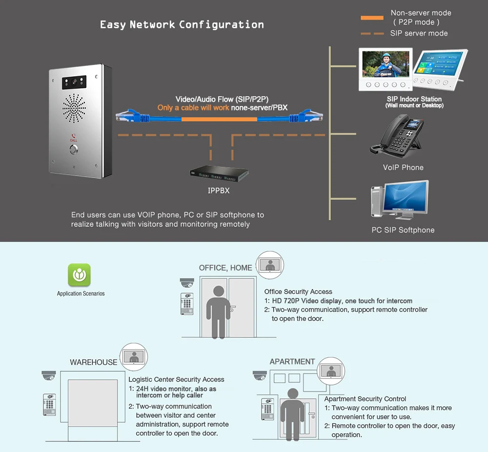 Q514 является одним профессиональным решением для SIP видеодомофона, трансляции, Paging, дверного телефона с большим объемом, может быть легко настроен для: банка, школы, квартиры, города, парковочной станции, входа в здание, И т. Д. (даже без сервера/PBX), также хорошее решение как вызов SOS, аварийный интерком для промышленного, Общественный сад, вилла и т. Д.
