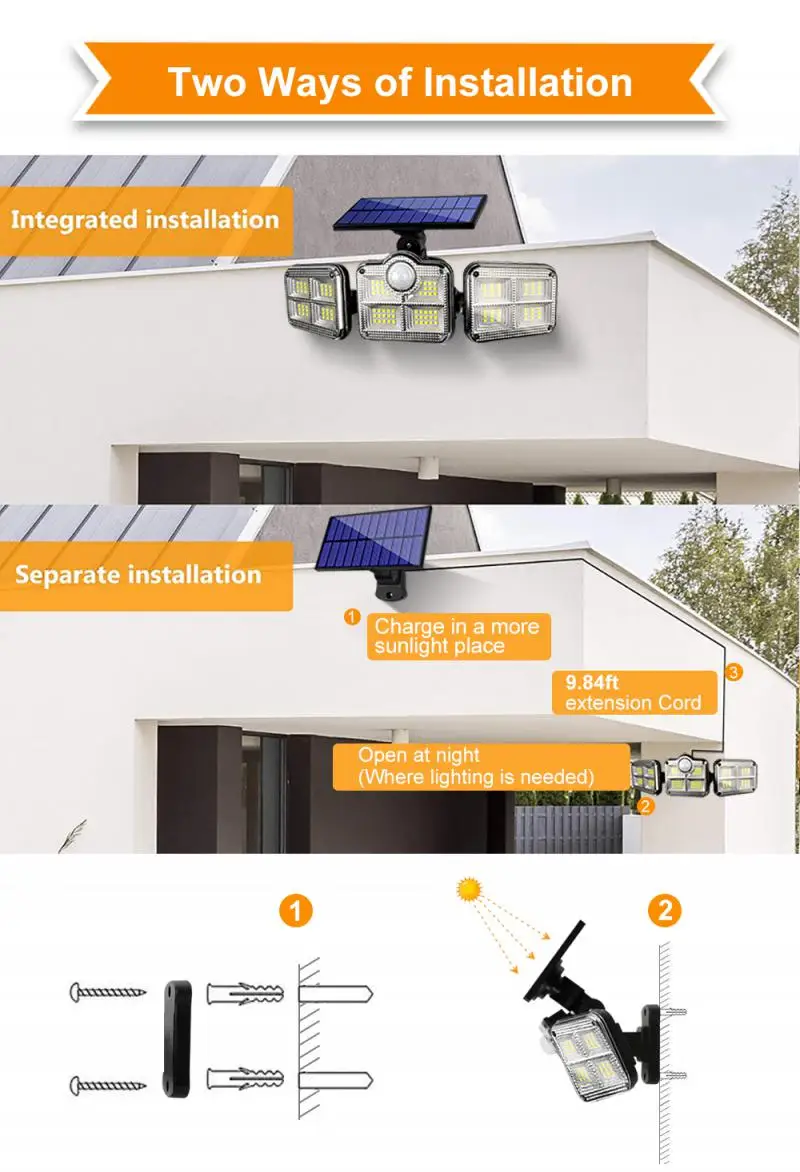 Посылка светодиодный солнечный свет включает в себя кронштейны и винты каждого светильника. Наружные огни безопасности движения могут быть установлены на стене с винтами и отлично подходят для патио, лужаек, патио, передней двери и т. Д.