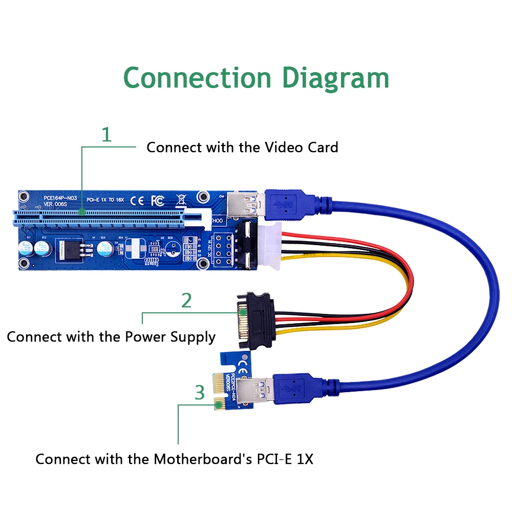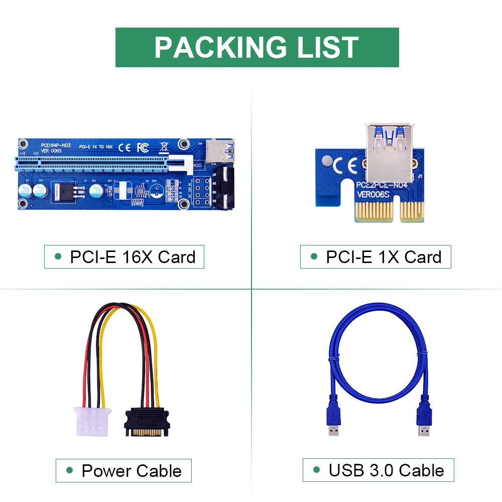 Карта PCI-E16x-1 шт.1 x PCI-E 1X картаКабель USB 3,0-1 шт.(2 типа, отправка наугад)1 х Кабель питания Примечание: поскольку каждая партия сырья может отличаться, плата PCIE riser может немного отличаться от внешнего вида (например, текстовое положение, кабель USB 3,0), но функция такая же. CHIPAL Technology обещает протестировать все PCIE стояки перед отправкой!1. Добро пожаловать в наш магазин! Пожалуйста, не стесняйтесь обращаться к нам через TradeManager или по электронной почте, если у вас есть какие-либо вопросы о наших продуктах и услугах!