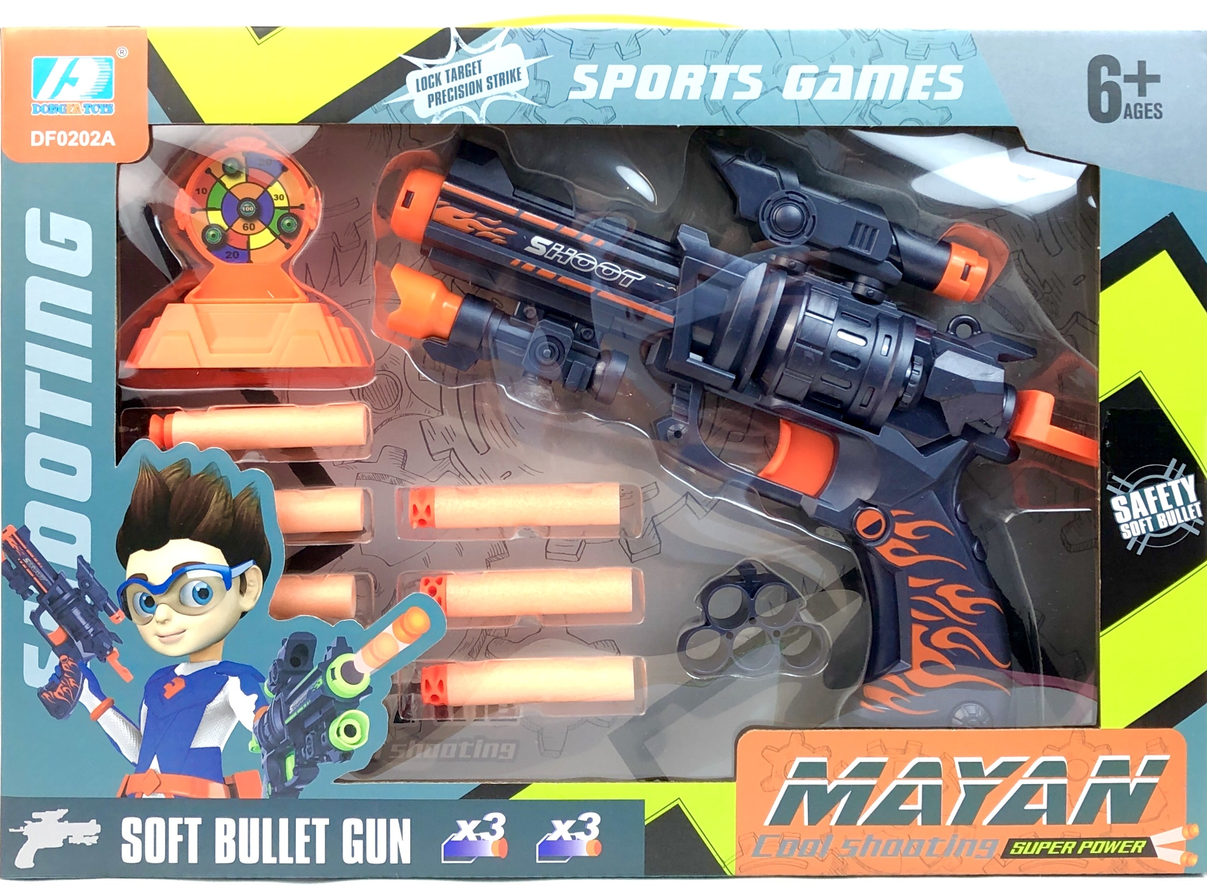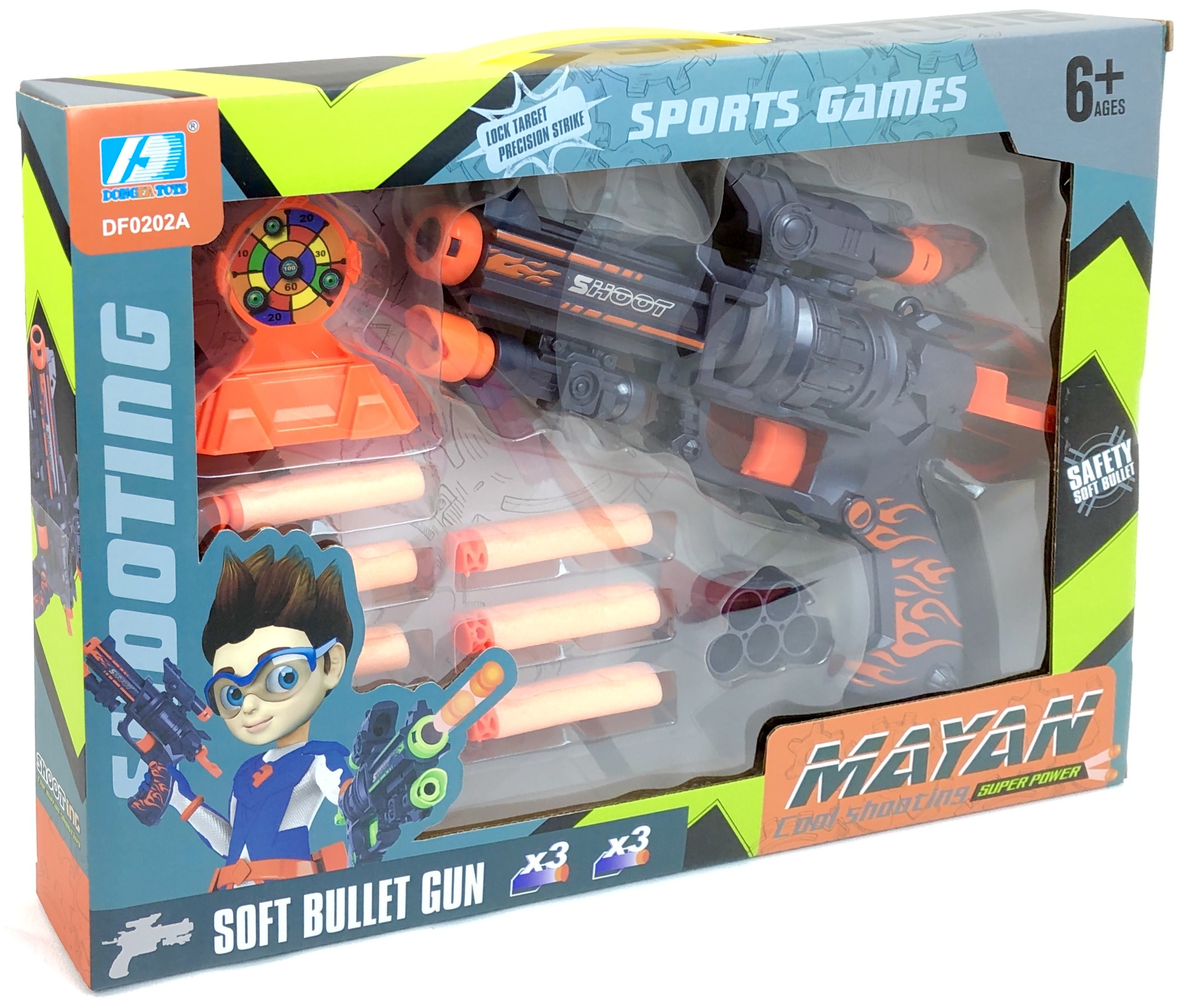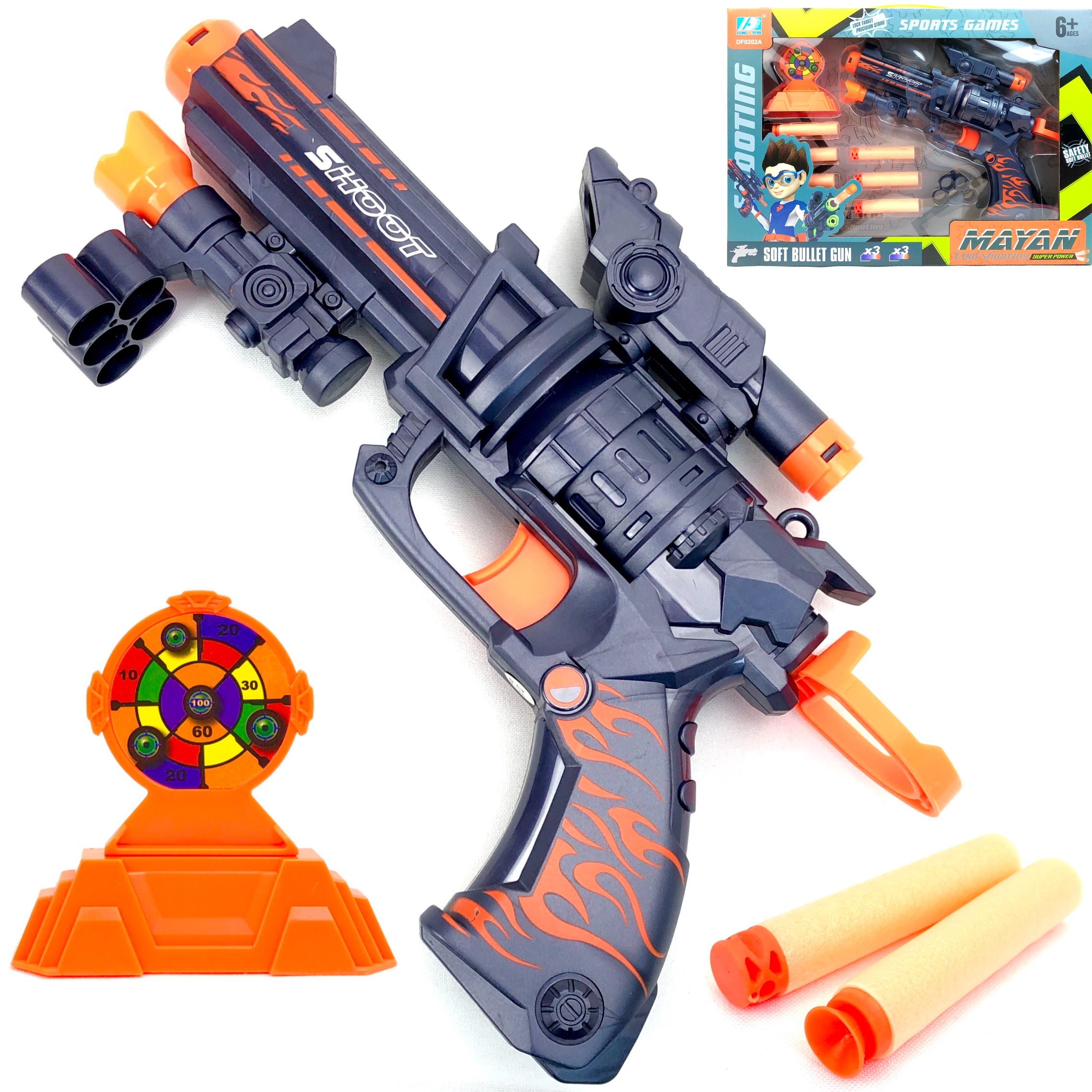 Комплектация: бластер, 6 патронов, насадка для патронов, мишень.