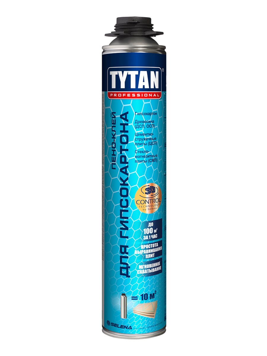Пено-клей для гипсокартона Tytan Professional. Преимущества: -Мгновенное схватывание отделочных панелей с поверхностью; -Возможность регулировки положения приклеиваемых материалов; -Отсутствие вторичного расширения после установки; -Коррекция неровностей основания до 20 мм; -Продолжение работ через 30 минут.
