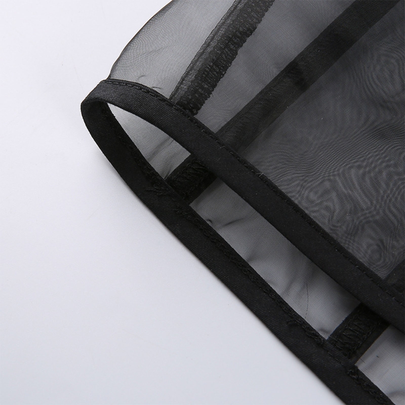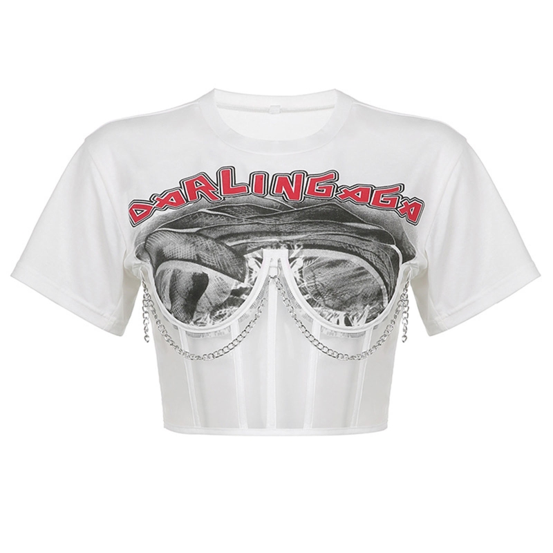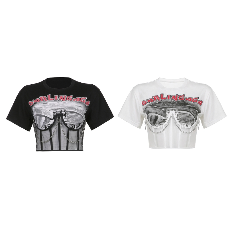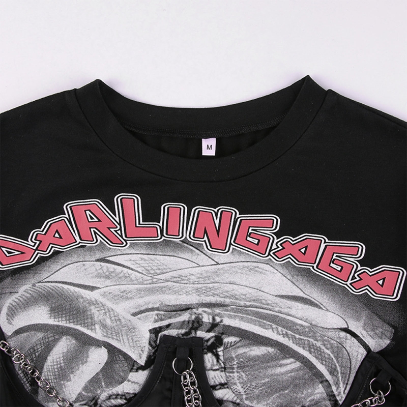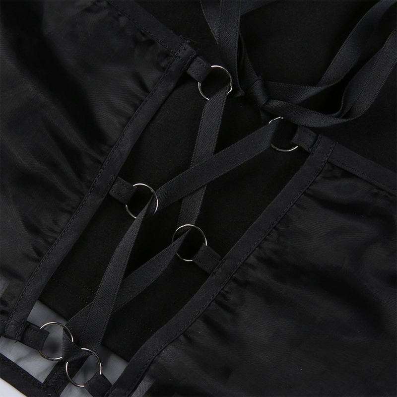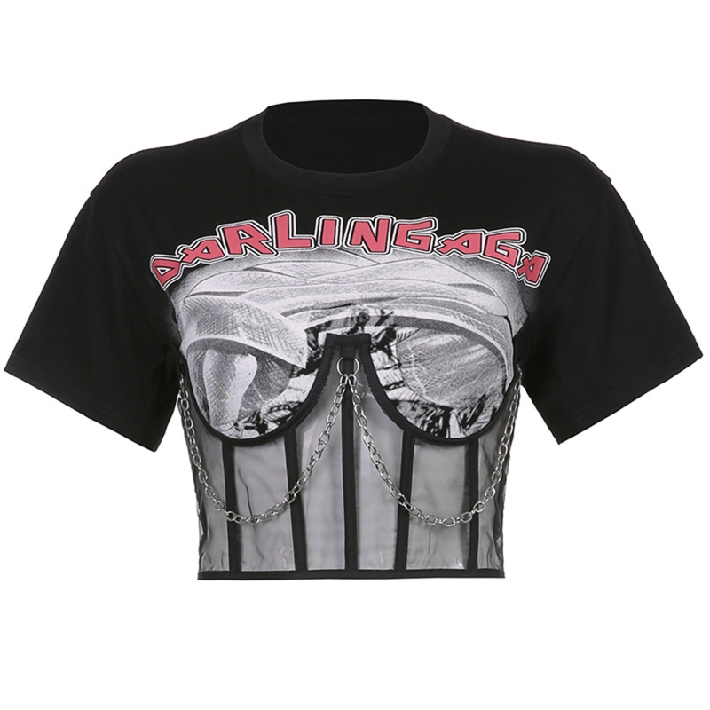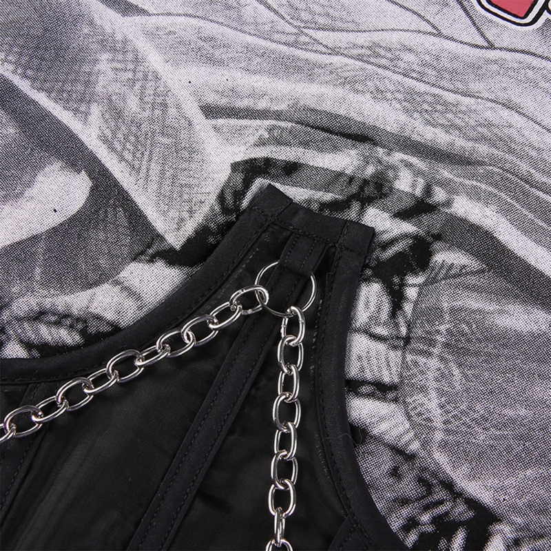 Готический панк стиль, графический принт с буквами, прозрачный сетчатый корсет и металлическая цепочка в стиле пэчворк, повязка на шнуровке сзади.